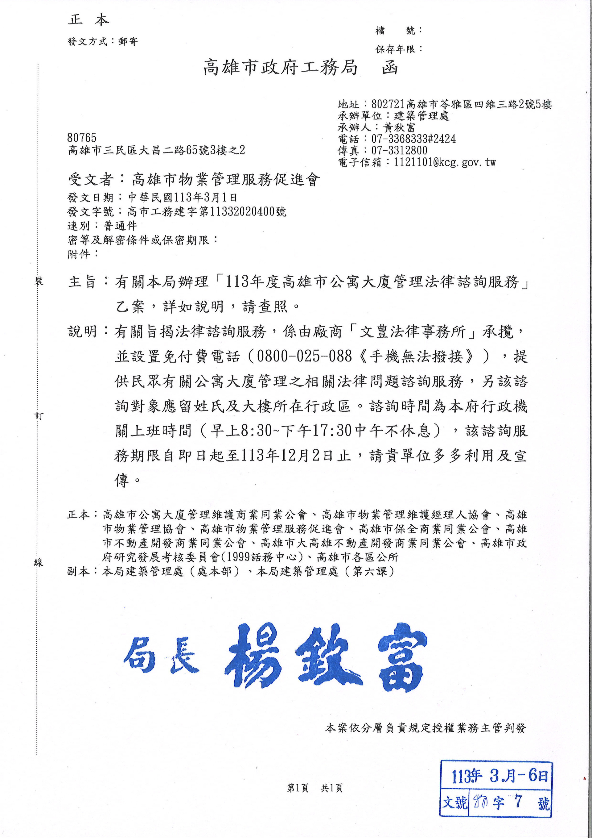 本局辧理[113年度高雄市公寓大廈管理法律諮詢服務]乙案