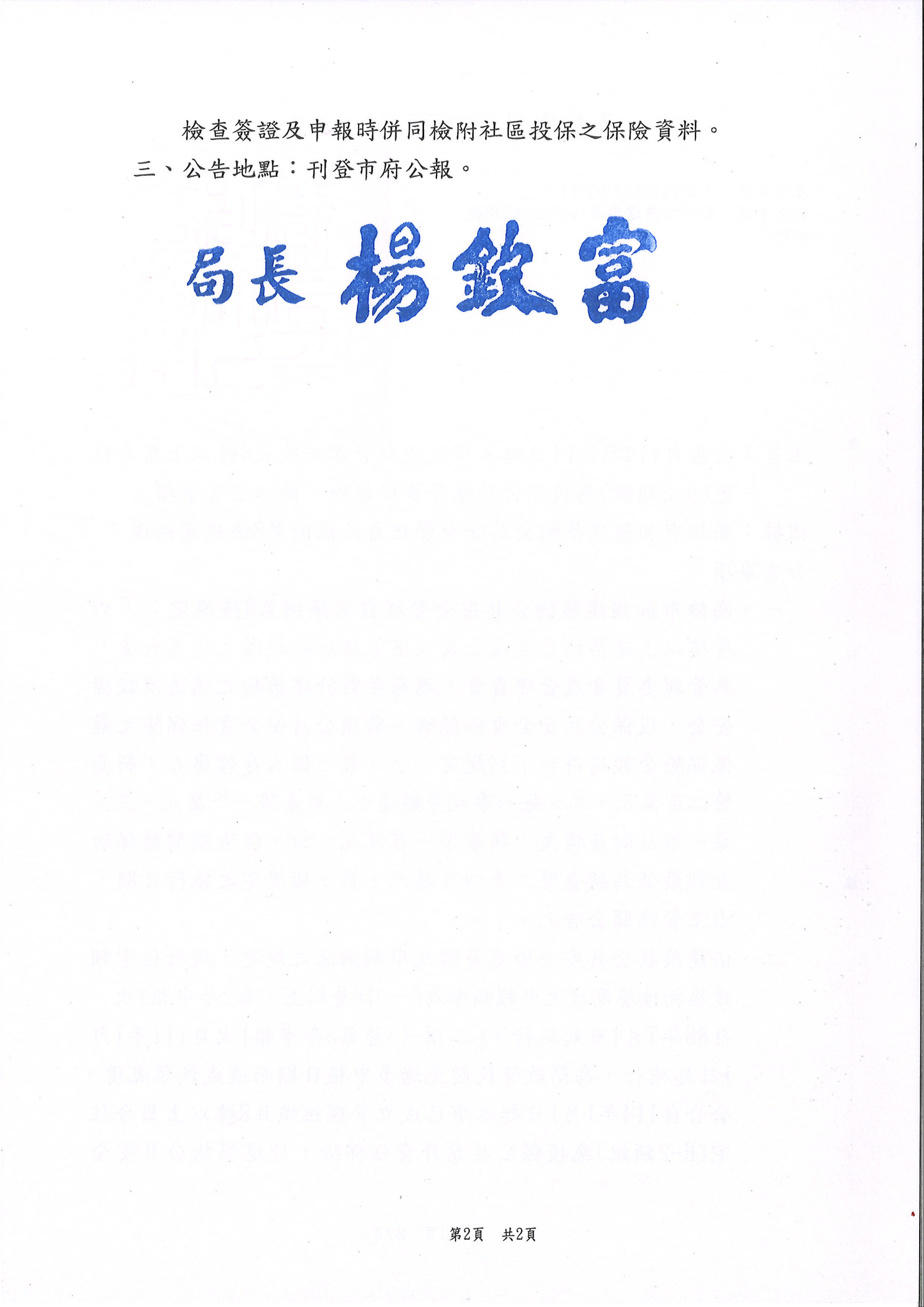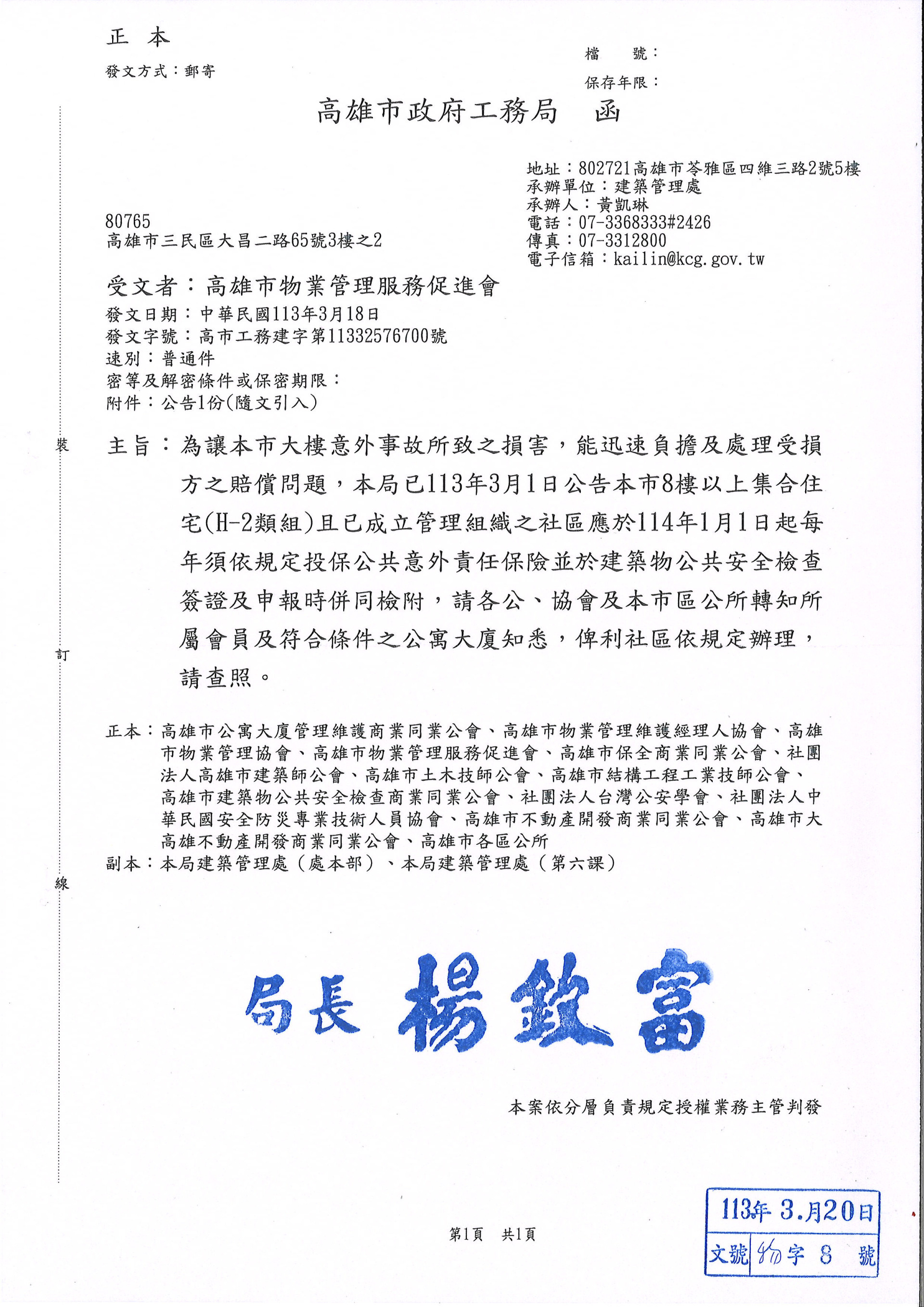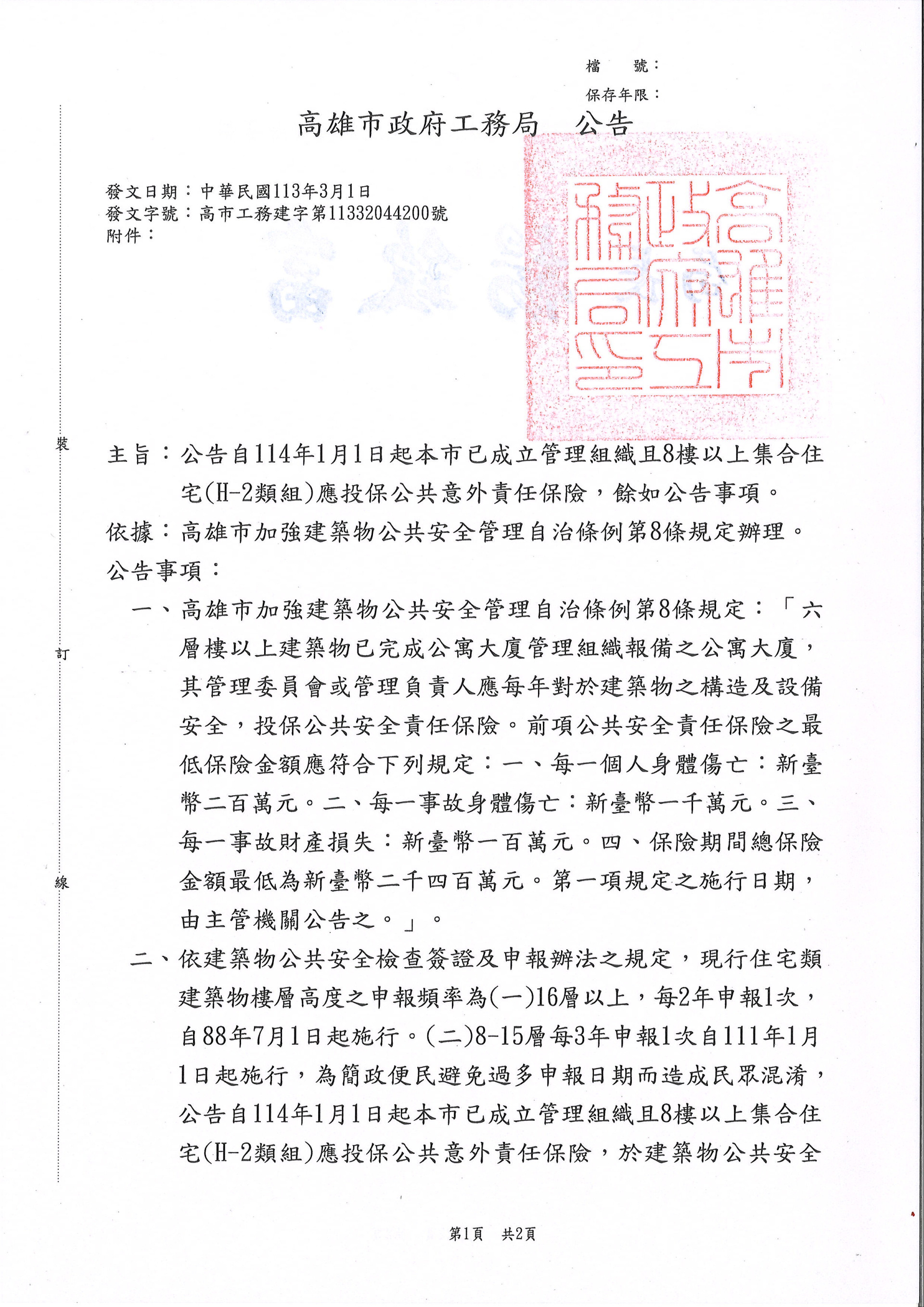 為讓本市大樓意外事故所致之損害,能迅速負擔及處理受損方之賠償問題,本局已113年3月1日公告本市8樓以上集合住宅且已成立管理組織之社區應於114年1月1日起每年須依規定投保公共意外責任保險並於建築物公共安全檢查簽證及申報時併同檢附