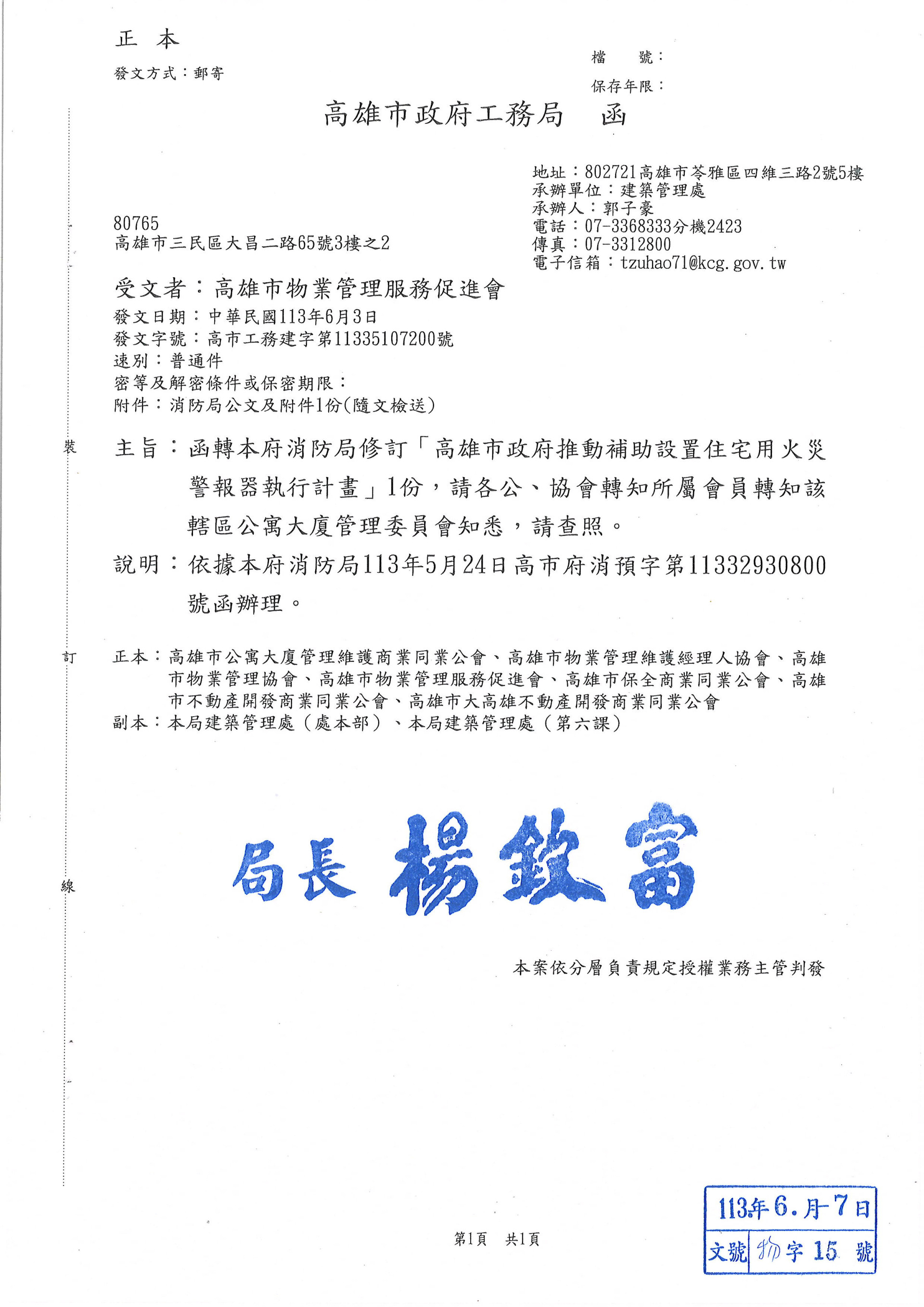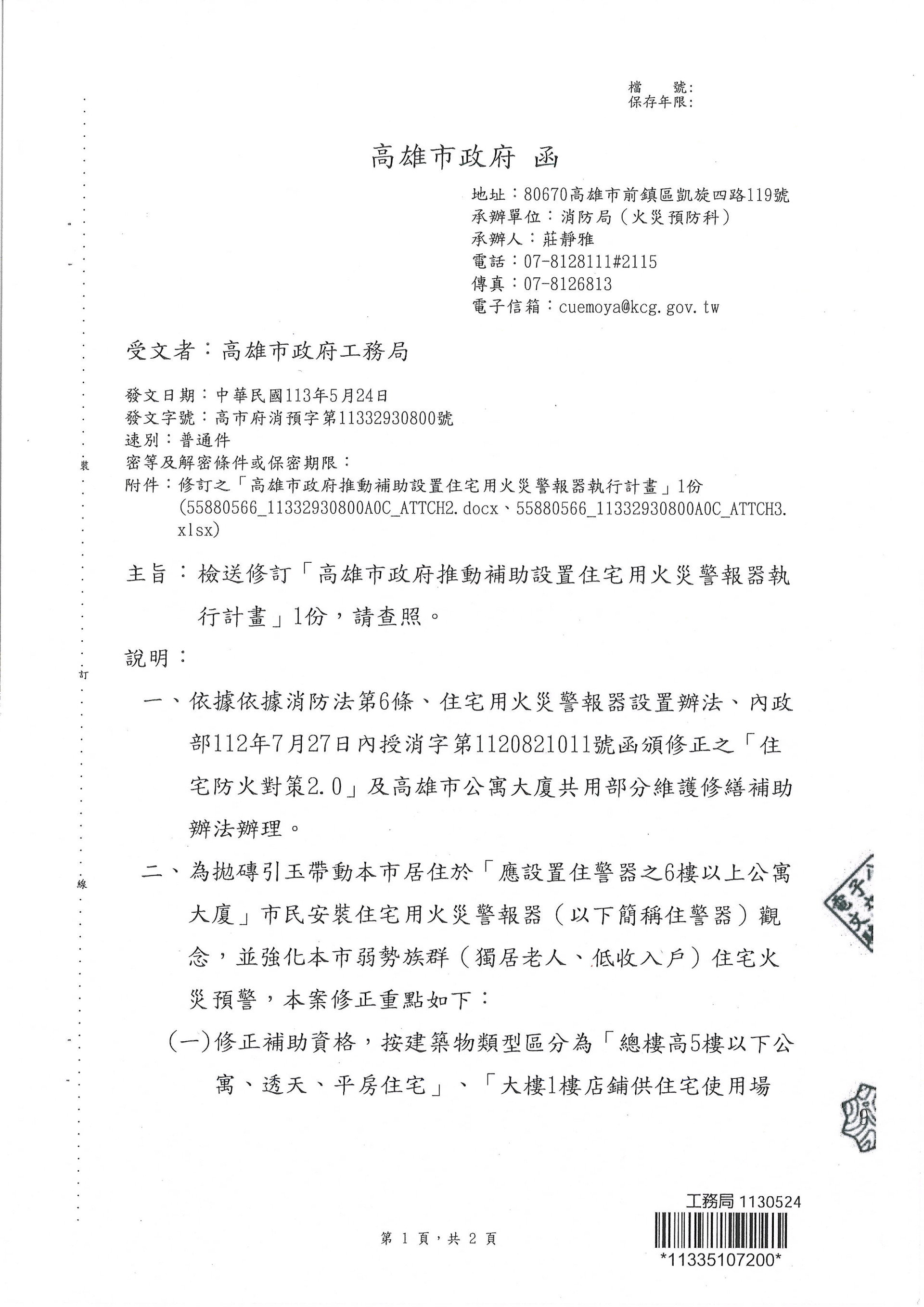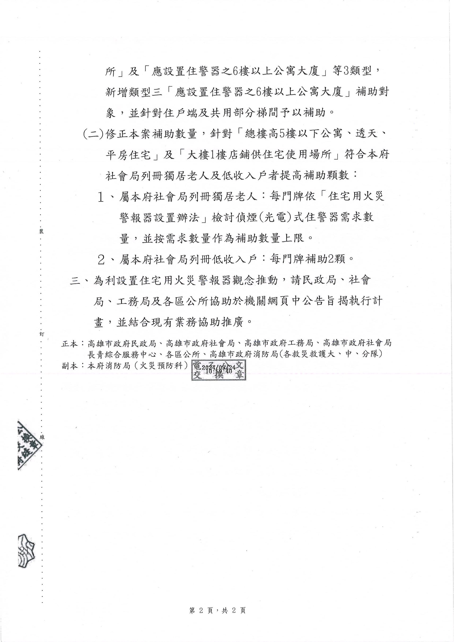 消防局修訂[高雄市政推動補助設置住宅用火災警報器執行計畫]