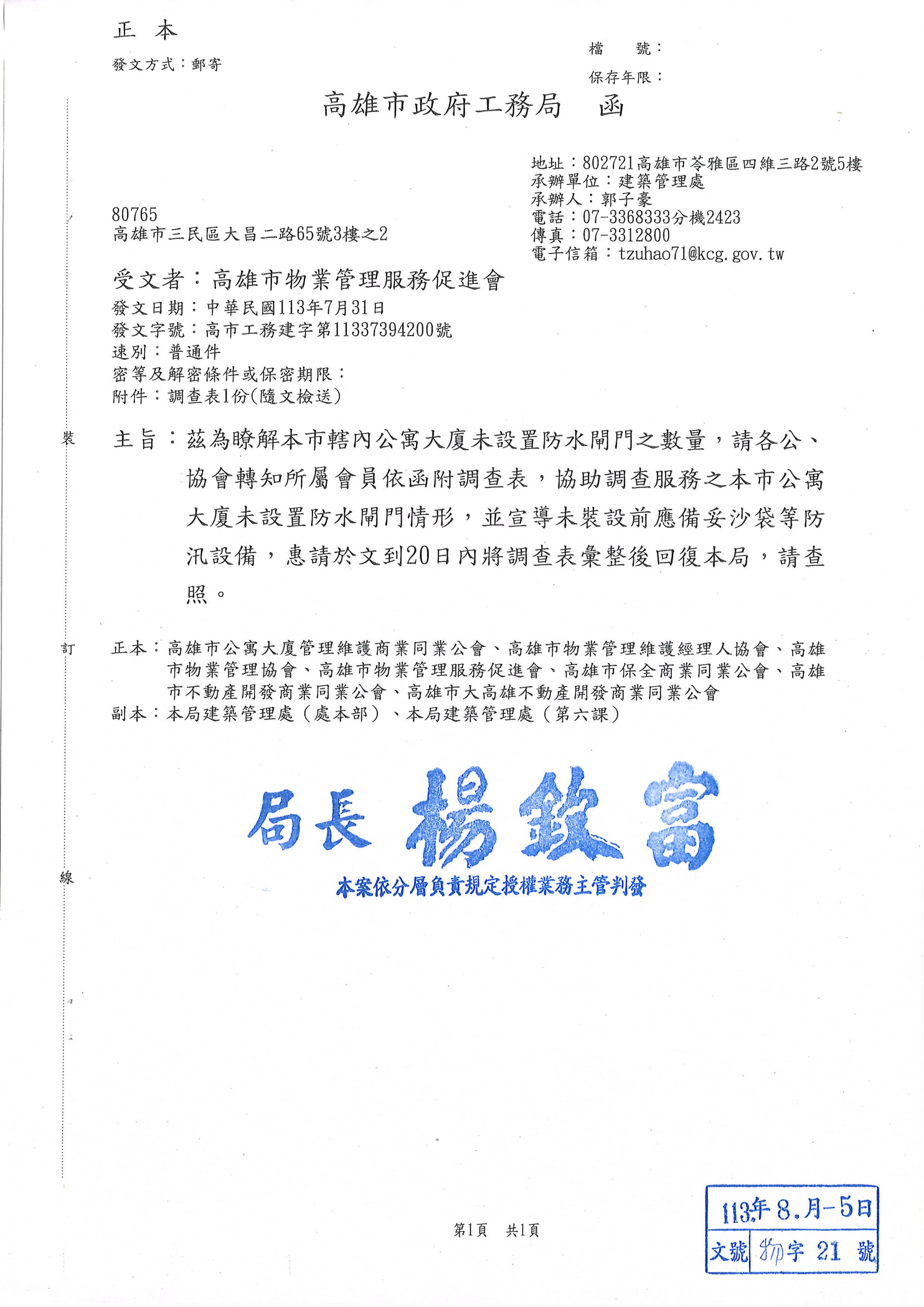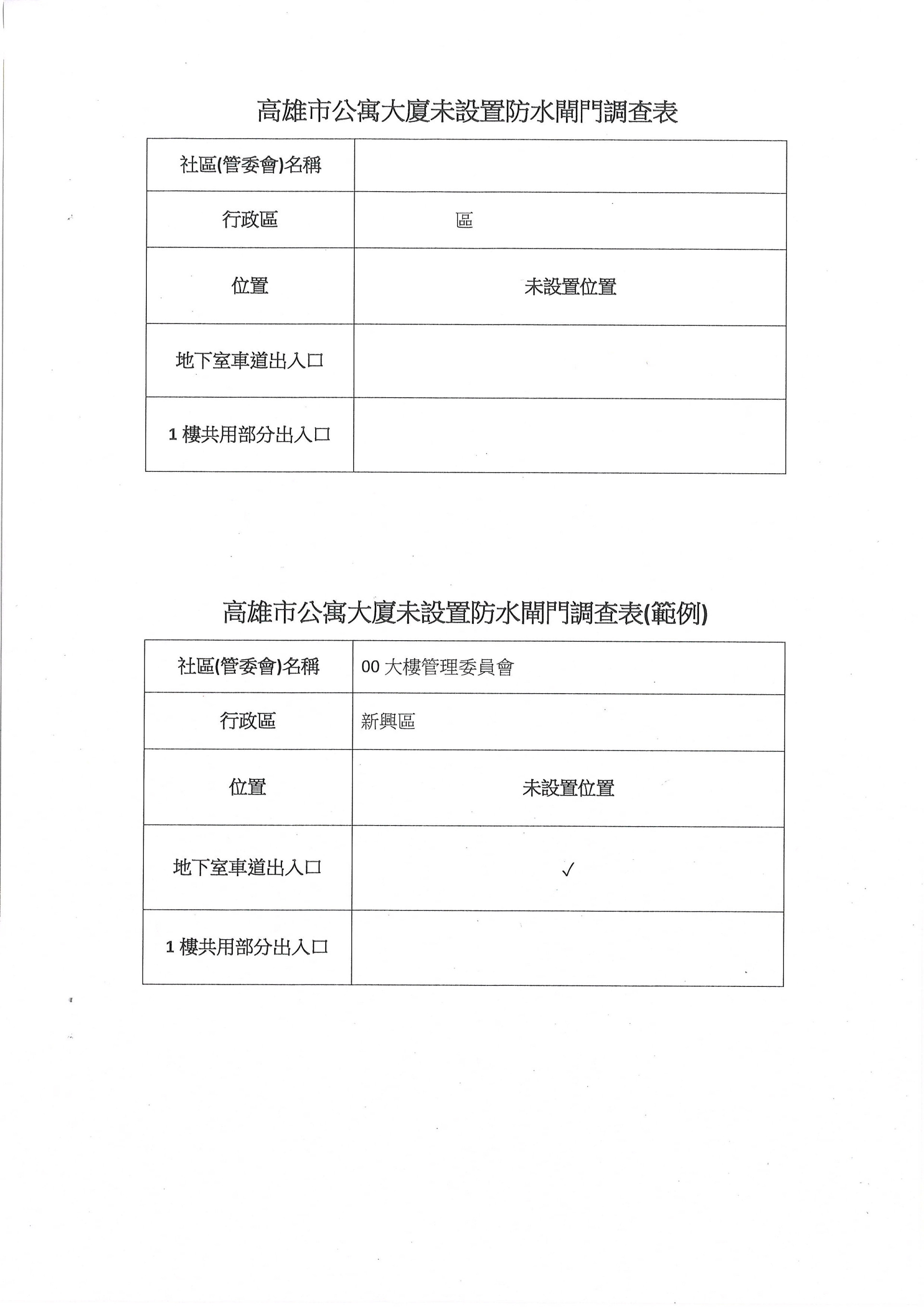 為瞭解本市公寓大廈未設置防水閘門之數量,請協助調查,並宣導未裝設前應備妥沙包等防汛設備