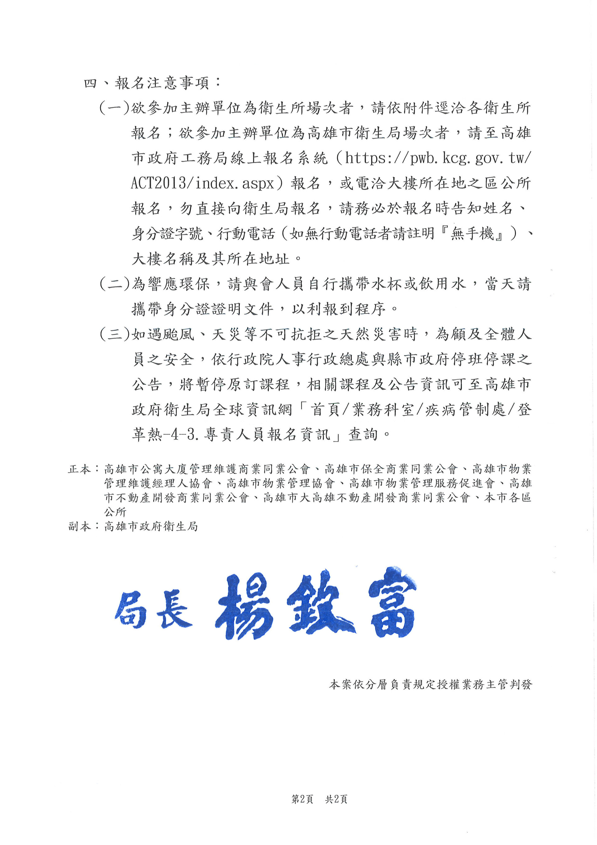 檢送衛生局與衛生所114年度1-5月舉辦[高雄市特定公私場所登革熱防制自主管理措施及查核辦法暨登革熱專責人員]教育訓練資訊