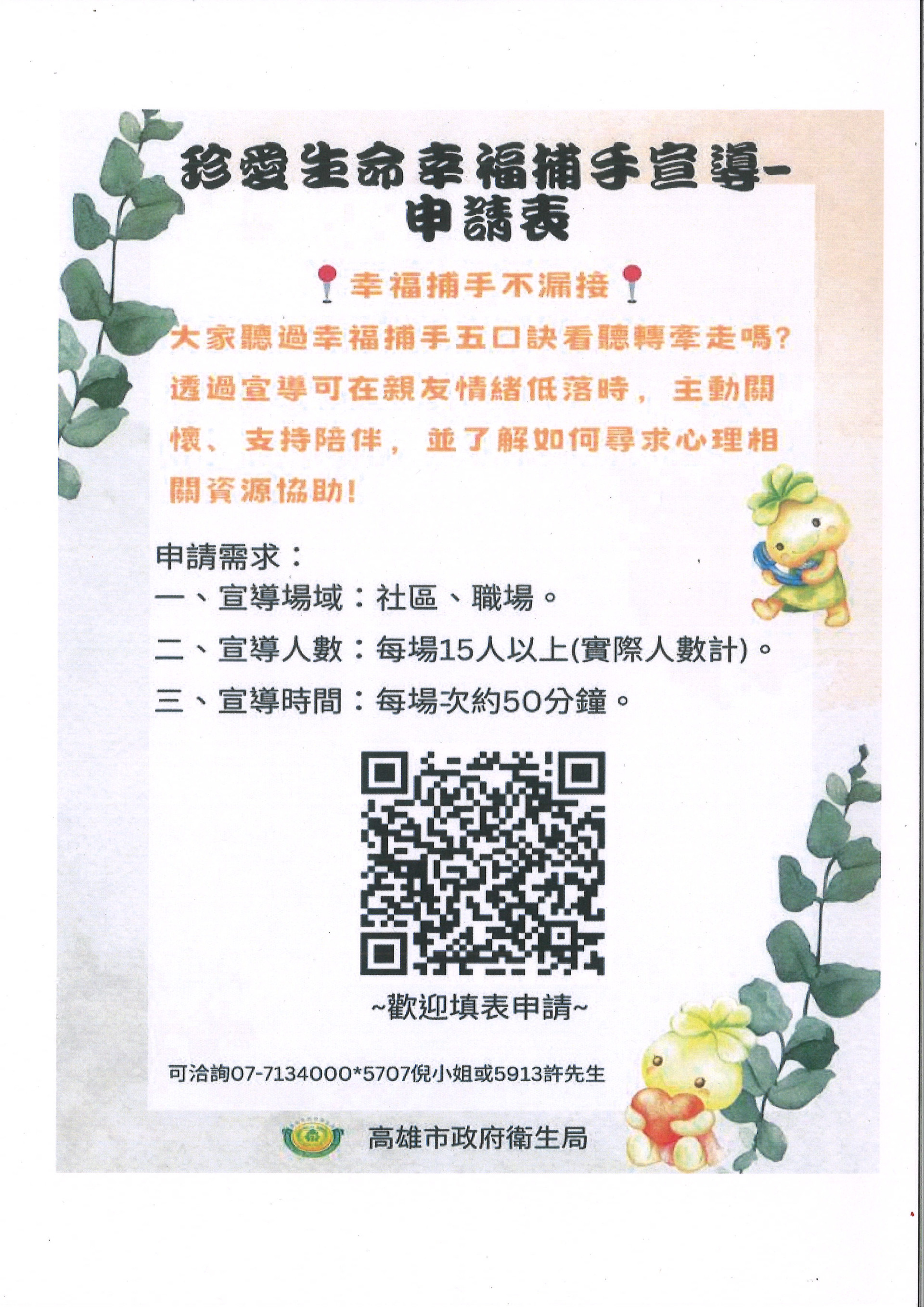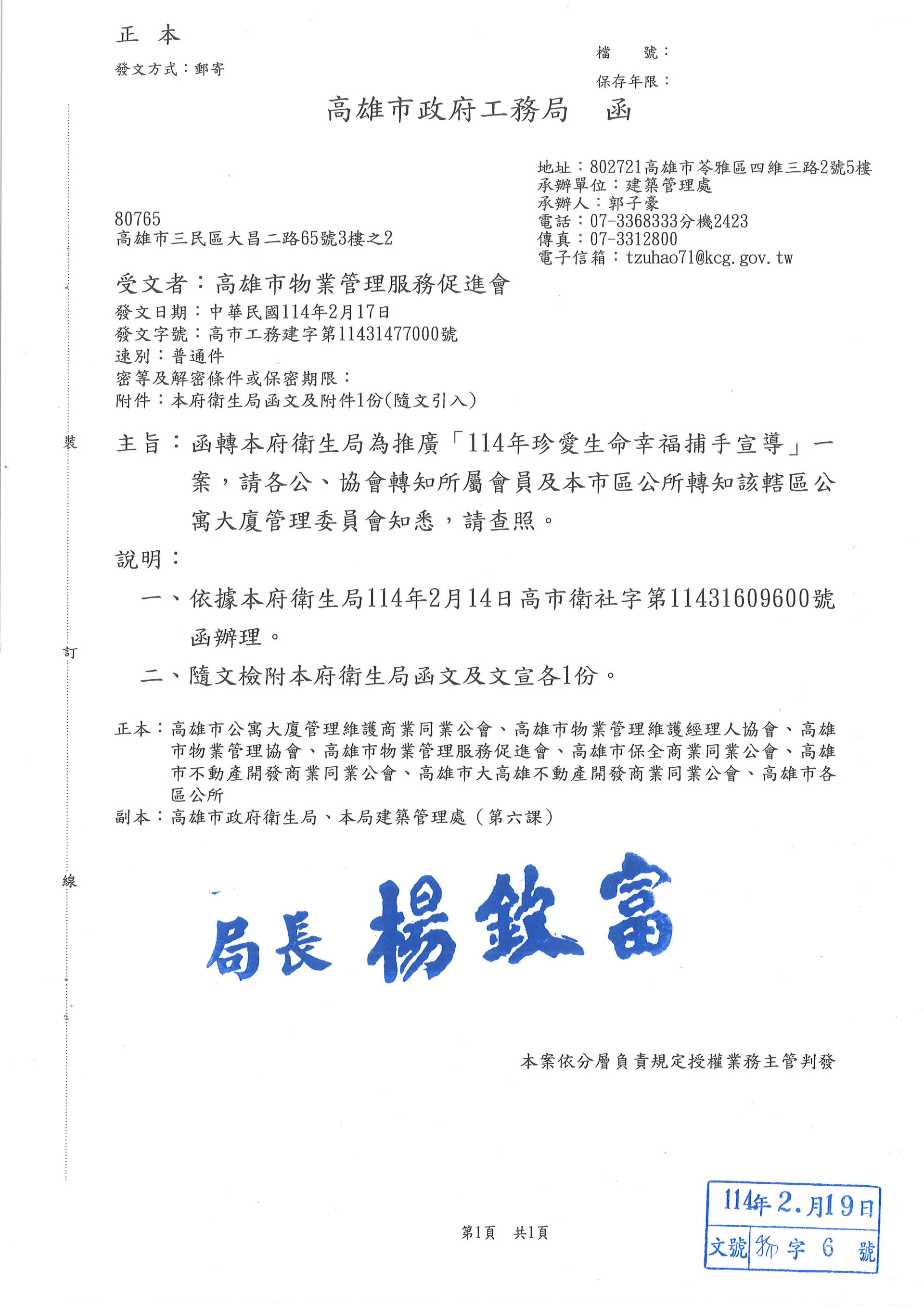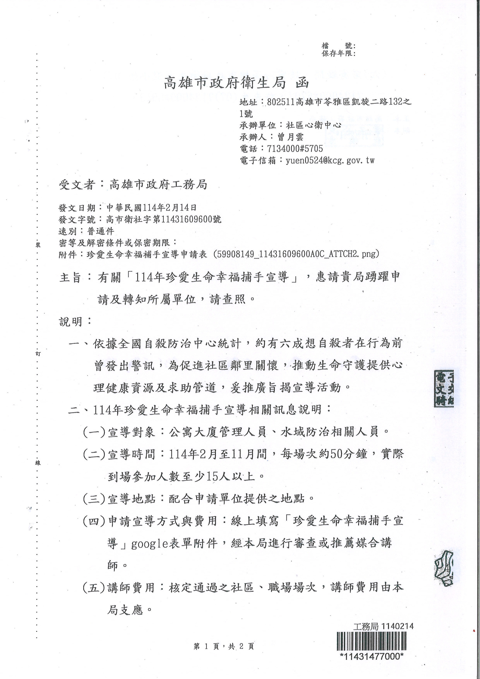 函轉本府衛生局為推廣[114年珍愛生命幸福補手宣導]一案