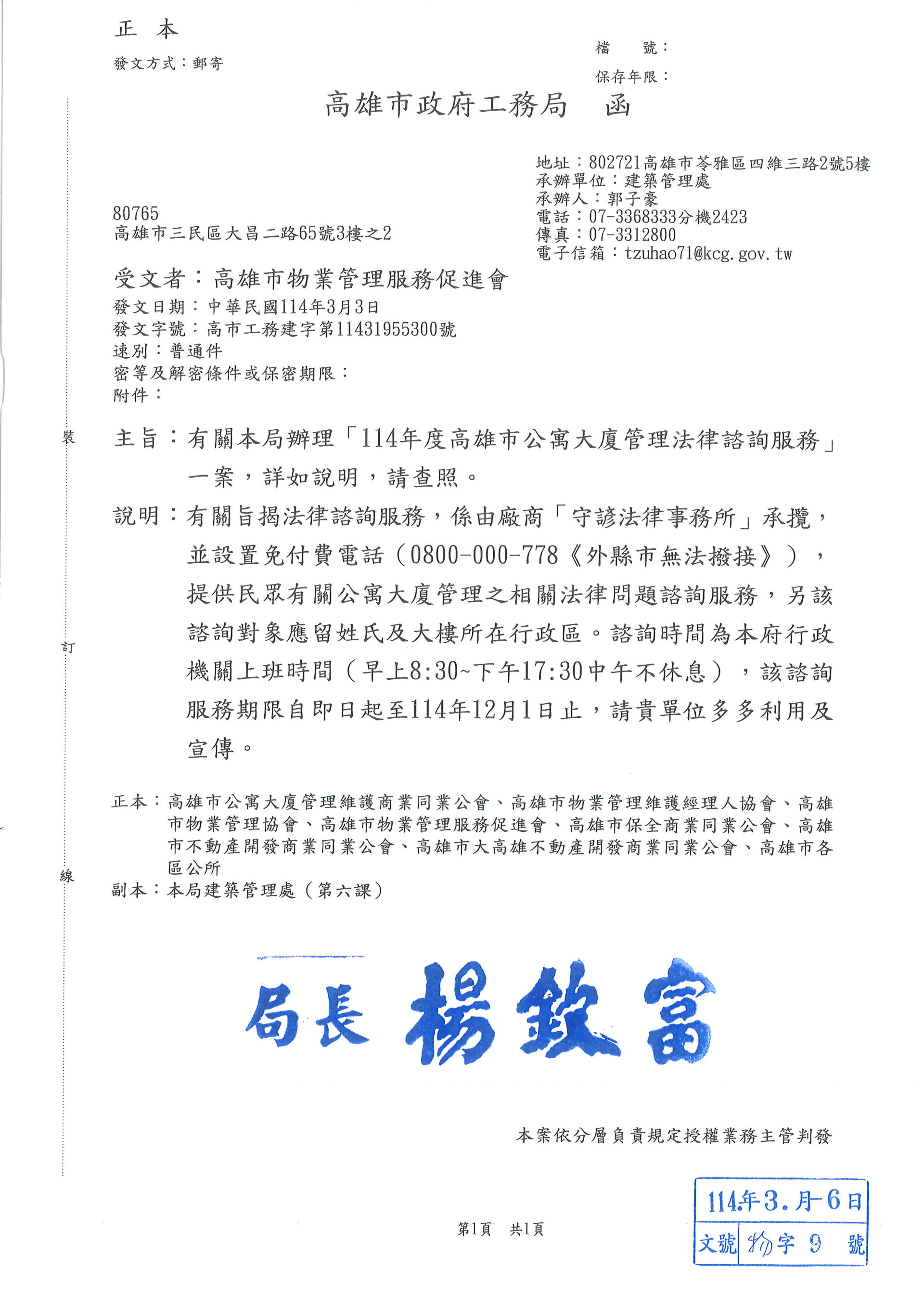 辧理[114年度高雄市公寓大廈管理法律諮詢服務]