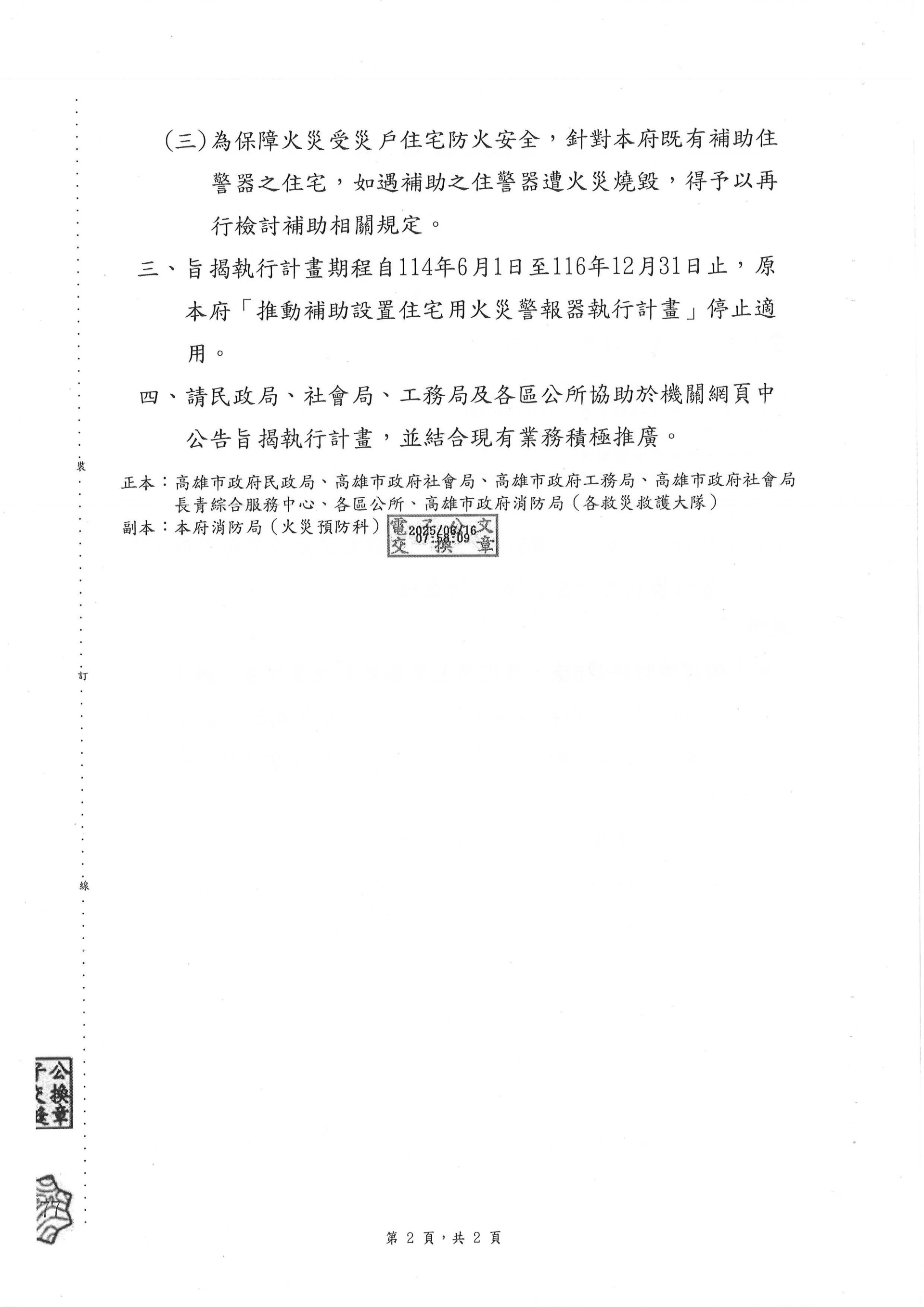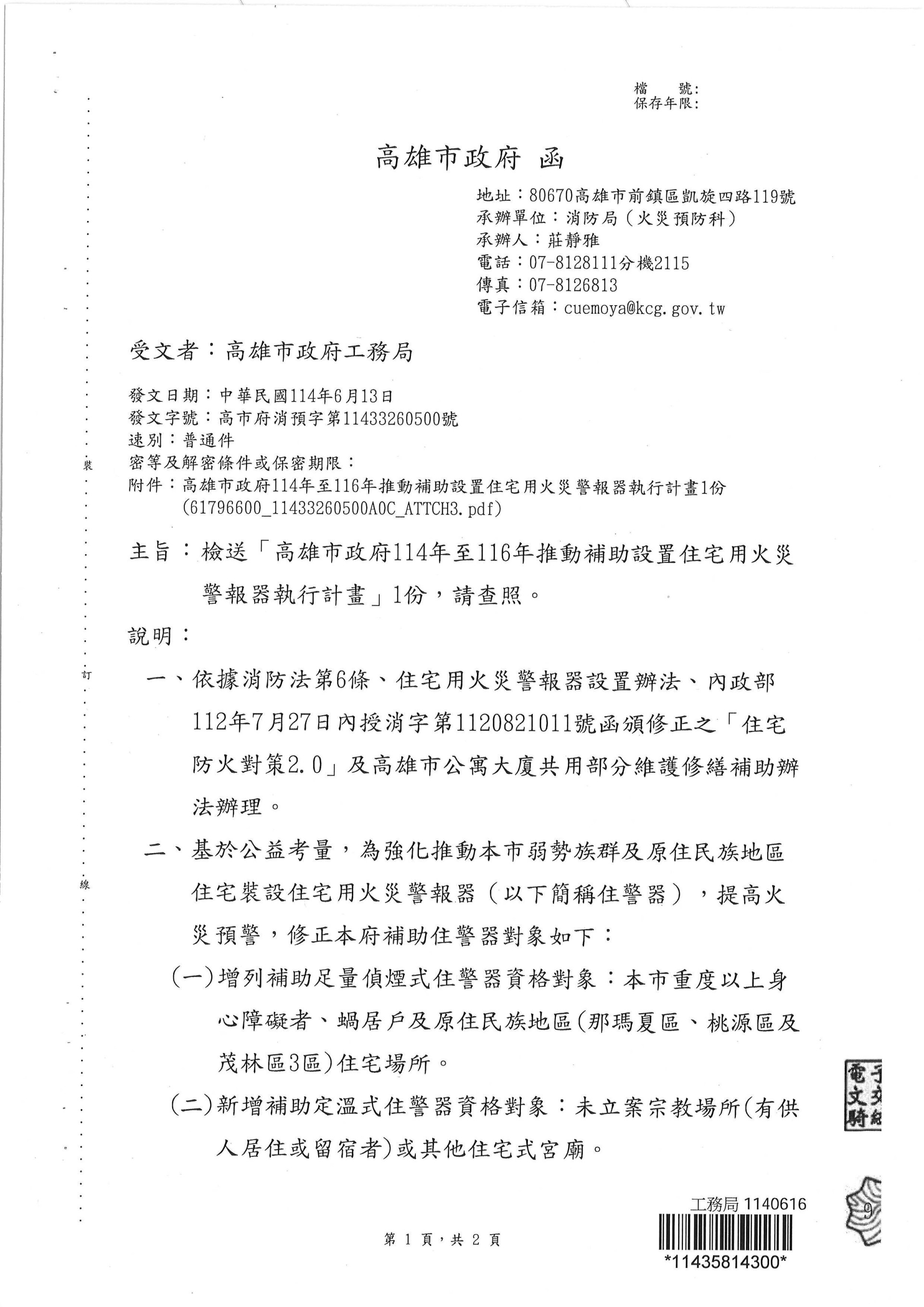 函轉本府消防局檢送[高雄市政府114年至116年推動補助設置住宅用火災警報器執行計畫]