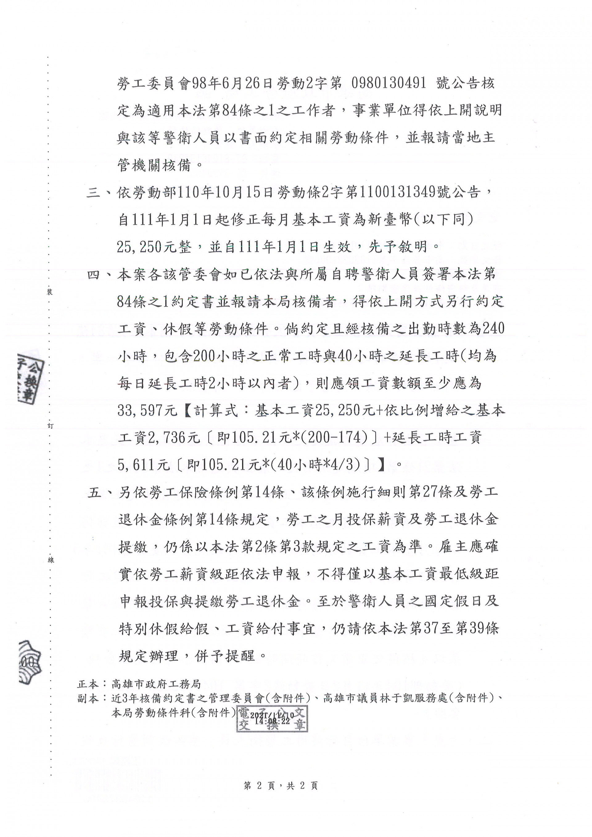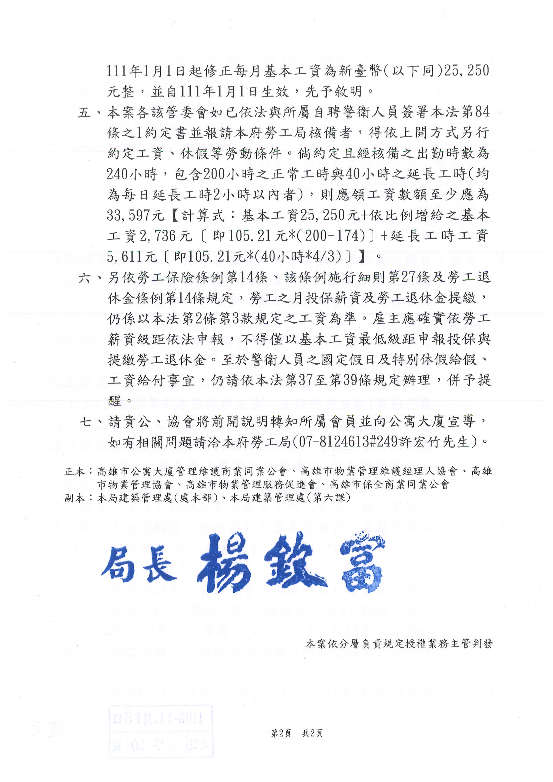 有關公寓大廈管理委員會依勞動基準法第84條之1規定自聘之警衛人員,其111年之薪資給付標準一案