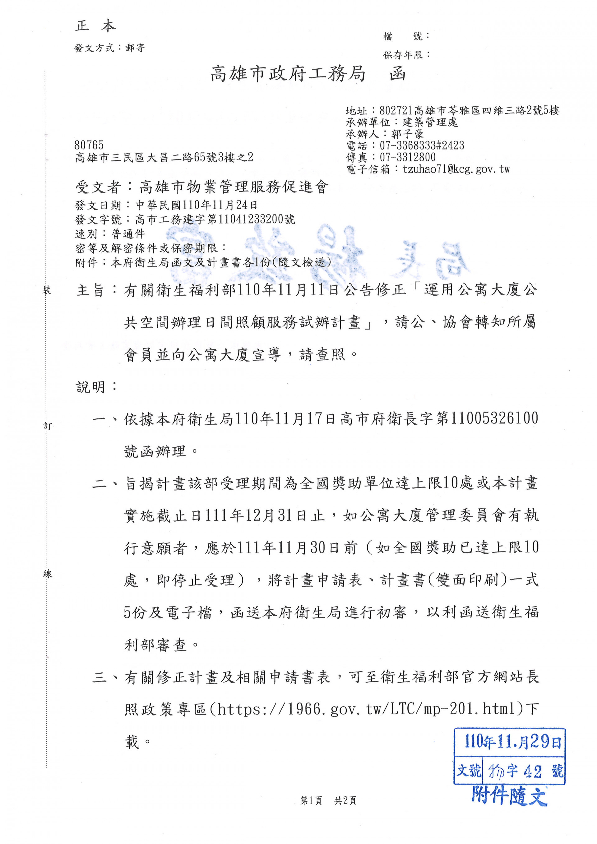 有關衛生福利部110年11月11日公告修正[運用公寓公共空間辦理日間照顧試辦計畫]