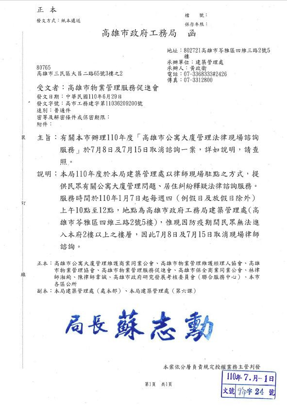 有關本市辦理110年度[高雄市公寓大廈管理法律現場諮詢服務]於7月8日及7月15日取消諮詢一案.