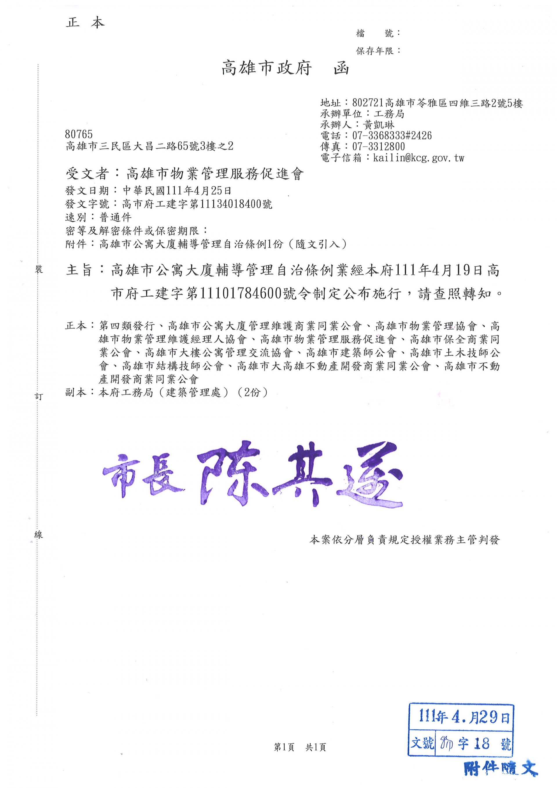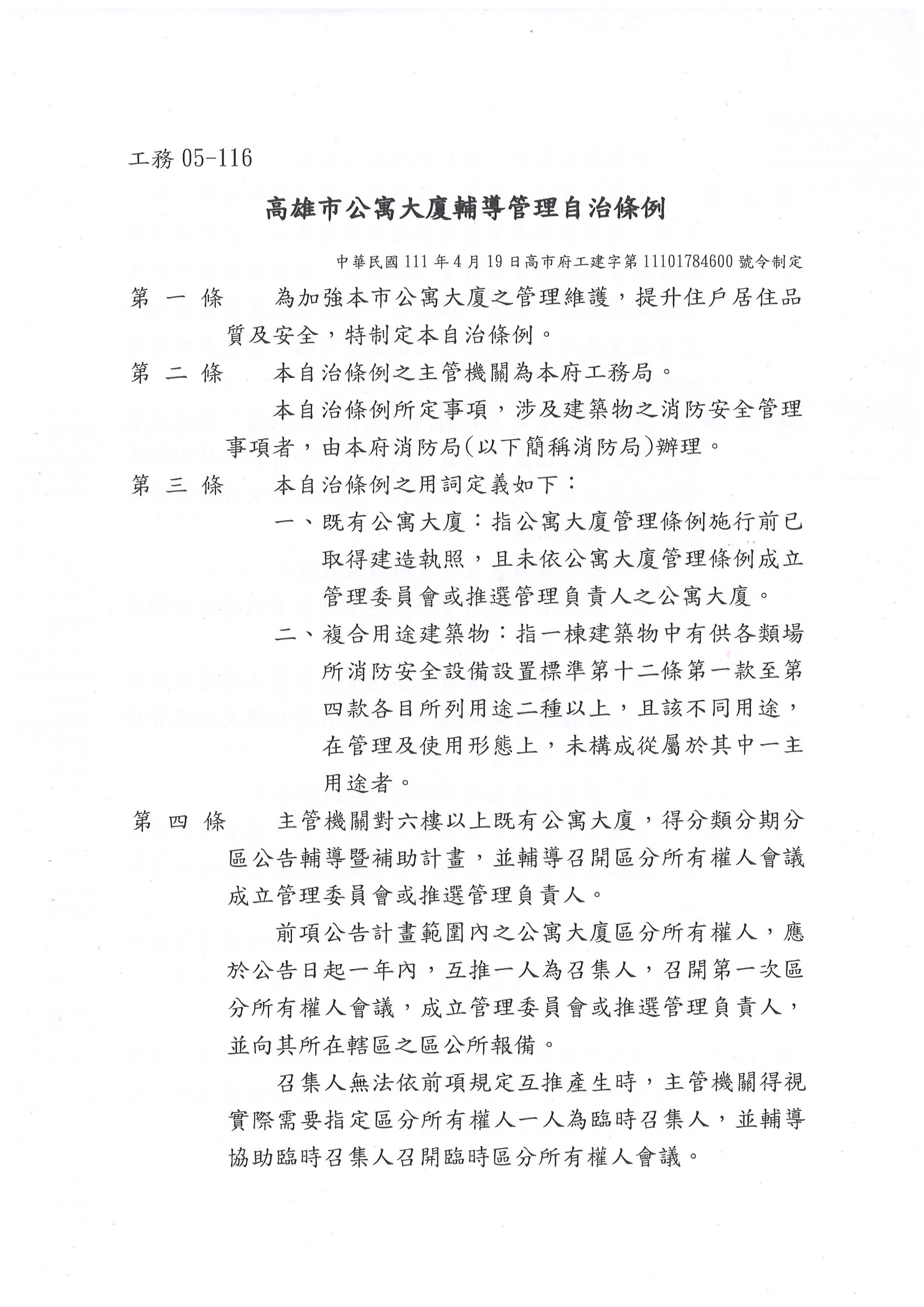 高雄市公寓大廈輔導管理自治條例業經本府111年4月19日高市府工建字第11101784600號令制定公布施行