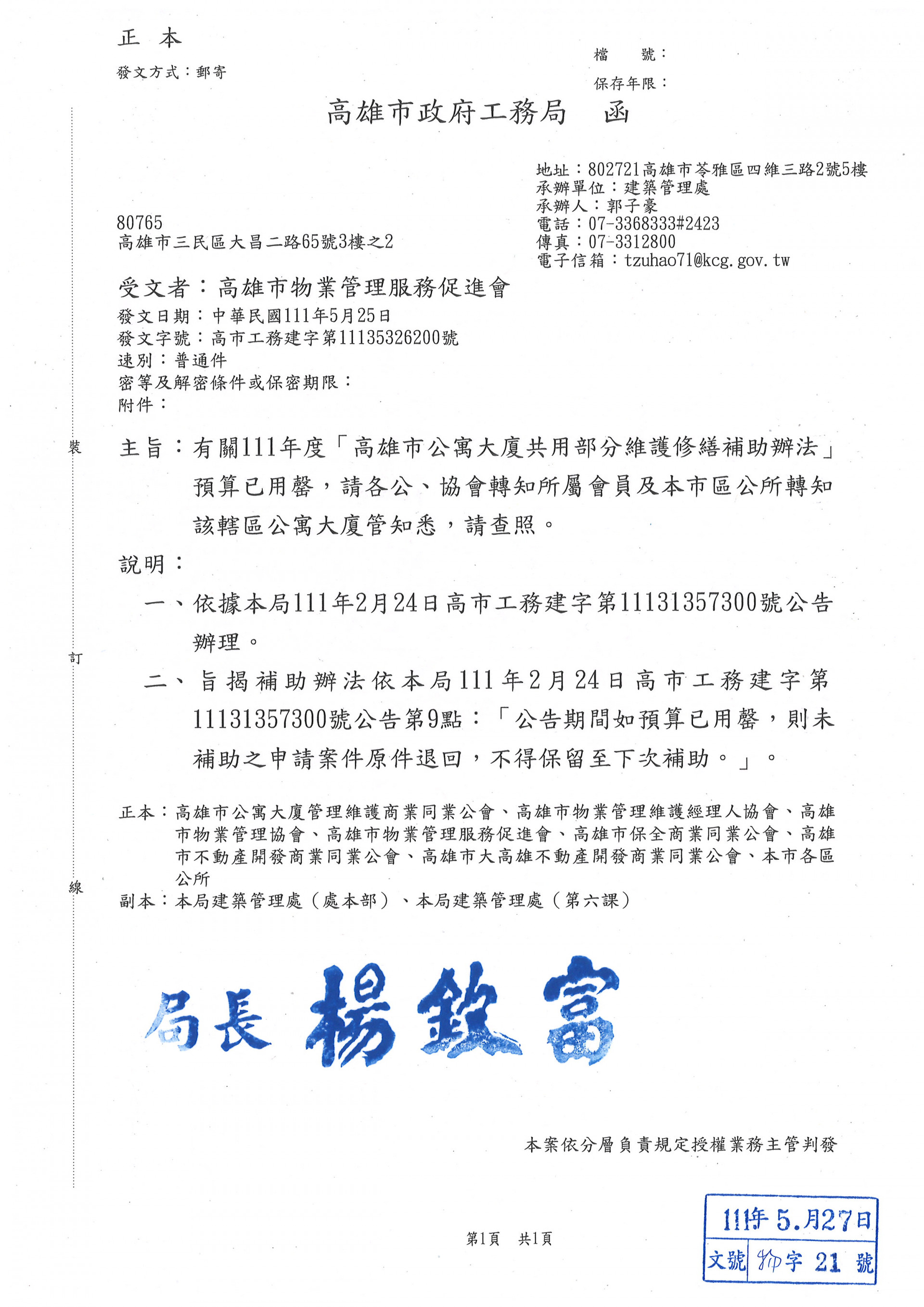 有關111年度[高雄市公寓大廈共用部分維護修繕補助辦法]預算已用罊