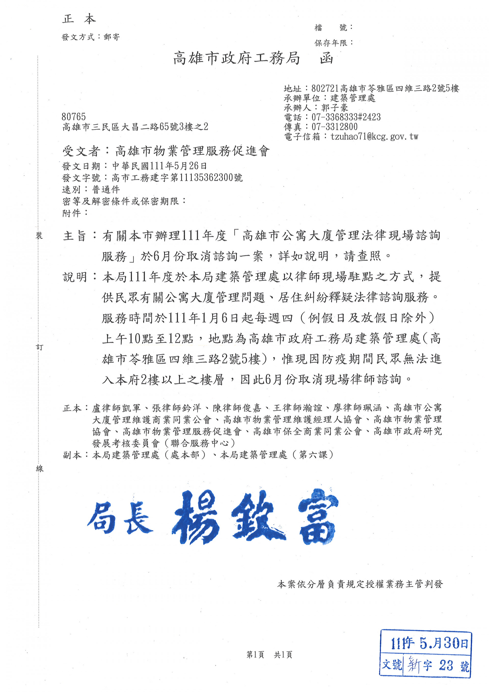 本市辦理111年度[高雄市公寓大廈管理法律現場諮詢服務]於6月份取消諮詢一案
