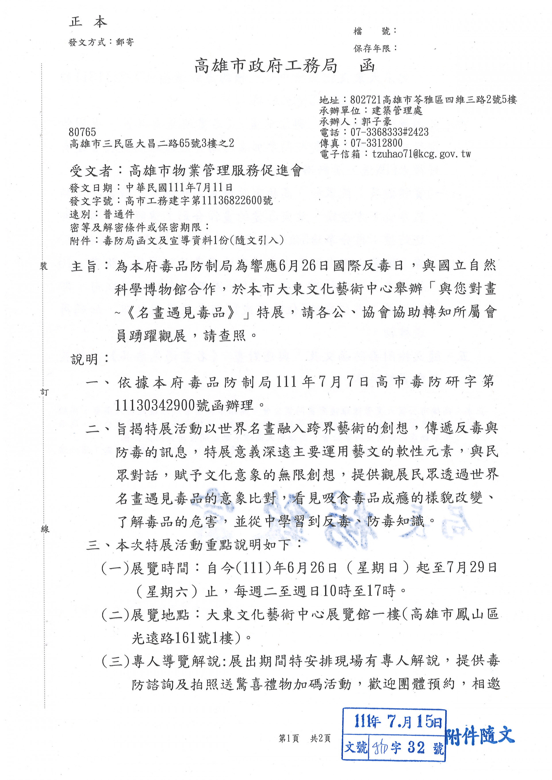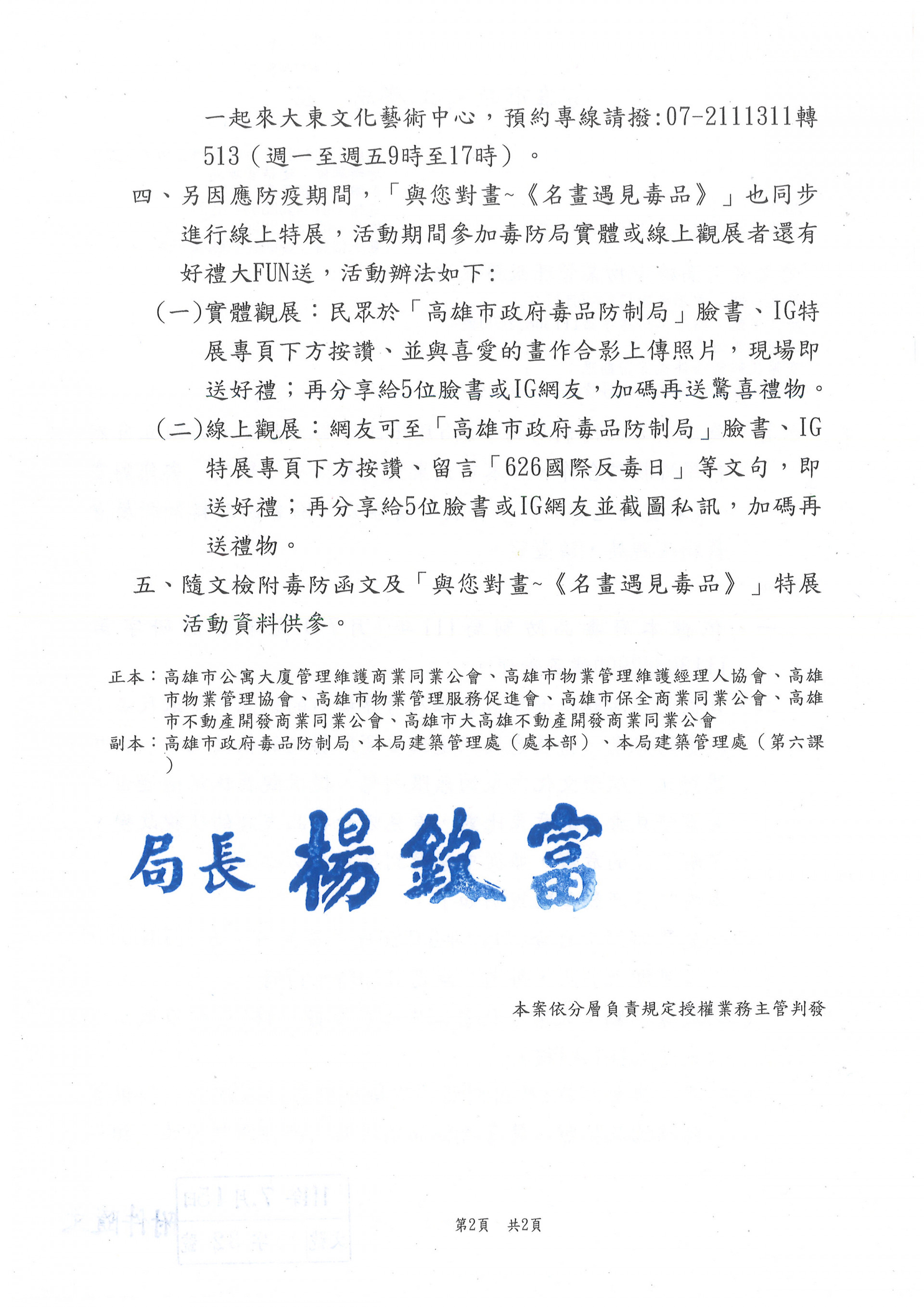 為本府毒品防制局為響應6月26日國際反毒日,與國立自然科學博物館合作,於本市大東文化藝術中心舉辦[與您對畫~<名畫遇見毒品>]特展