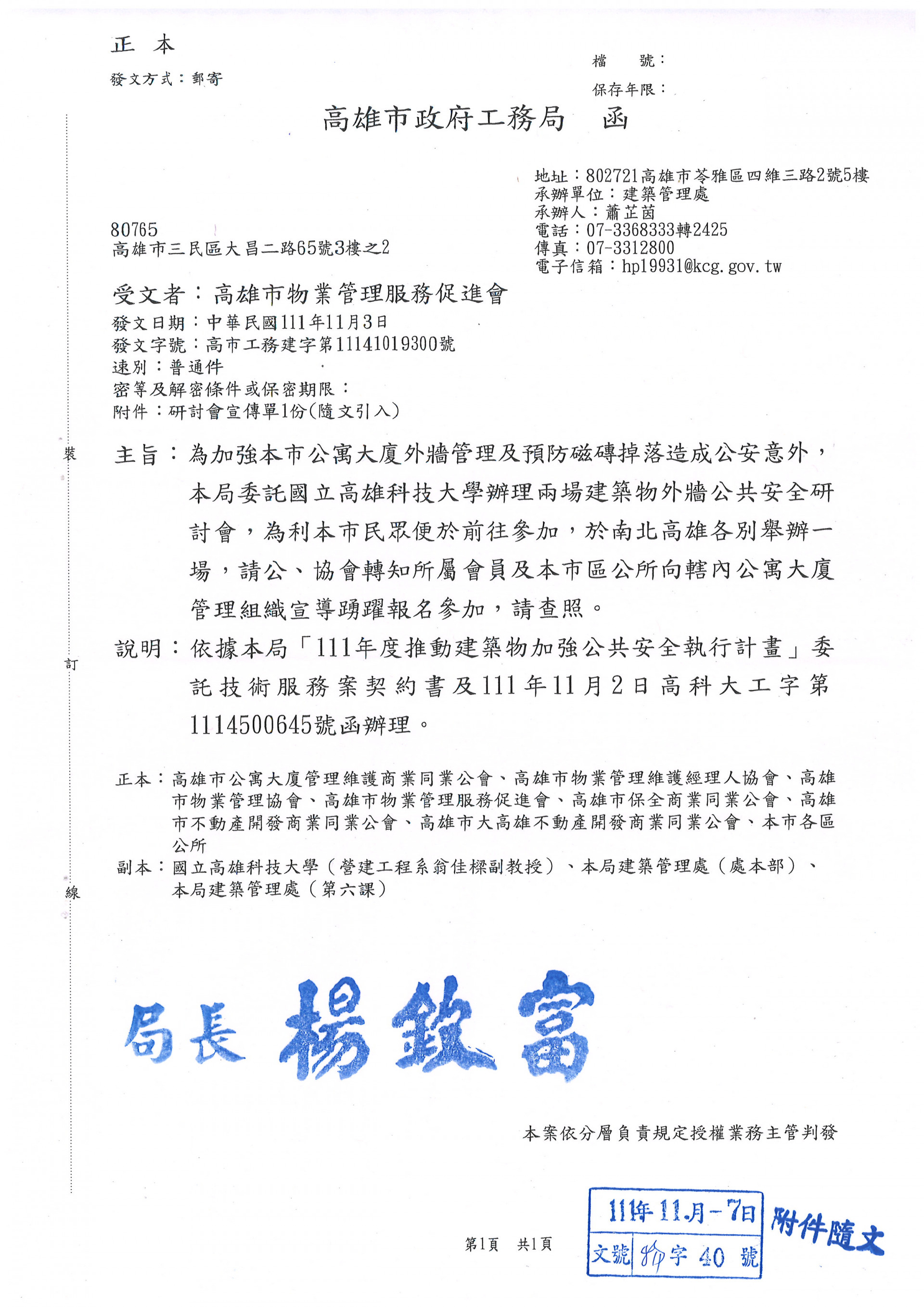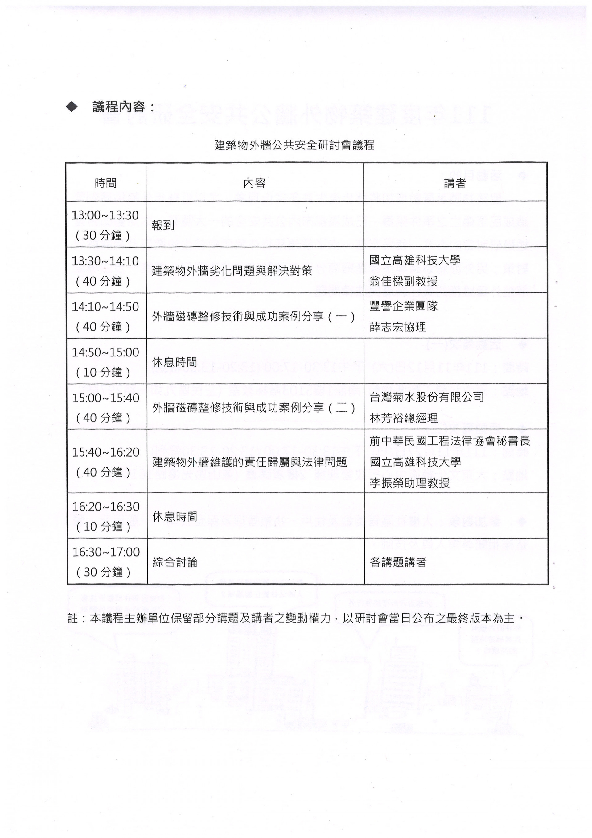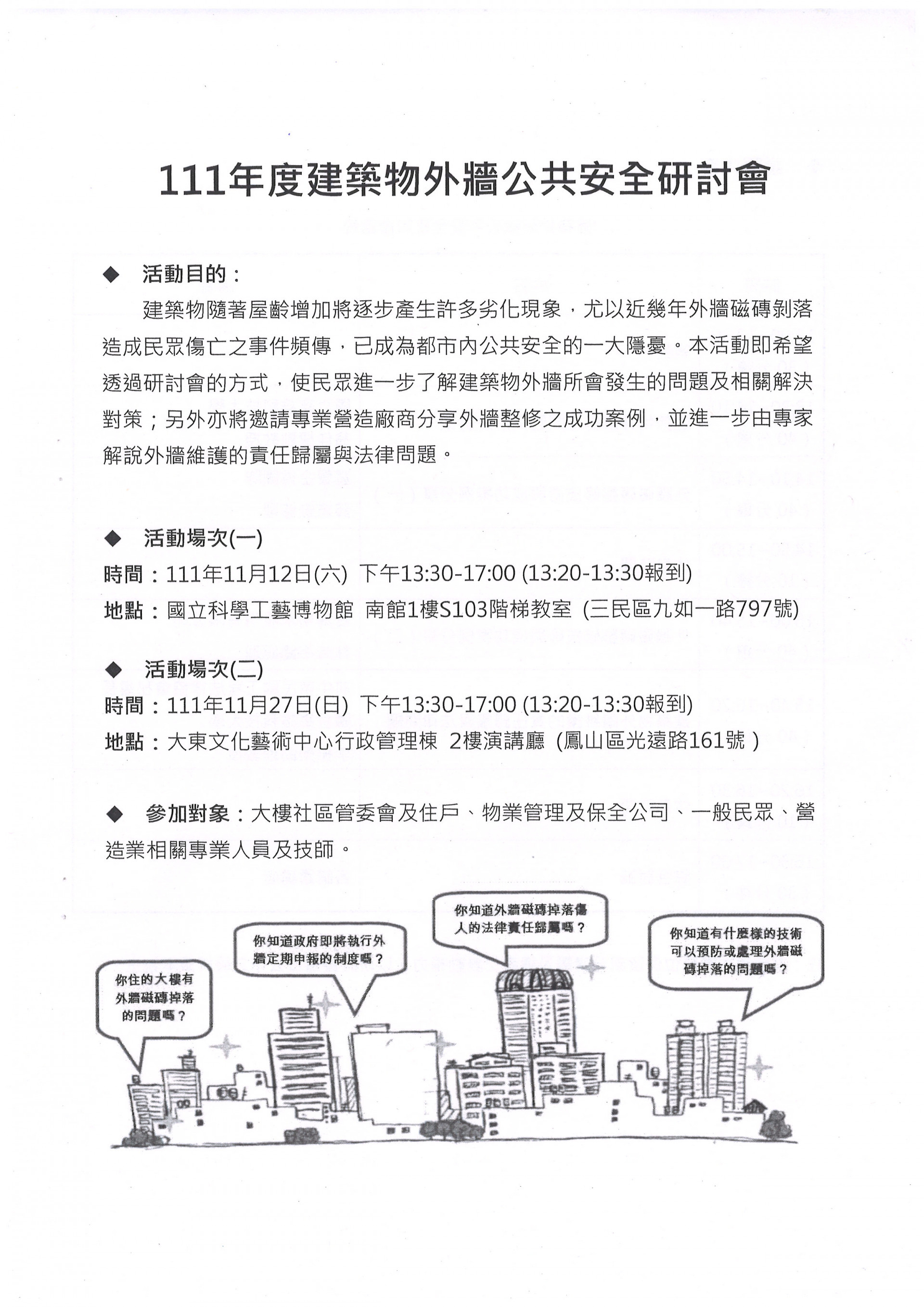 為加強本市公寓大廈外牆管理及預防磁磚掉落造成公安意外,本局委託國立高雄科技大學辦理兩場建築物外牆公共安全研討會