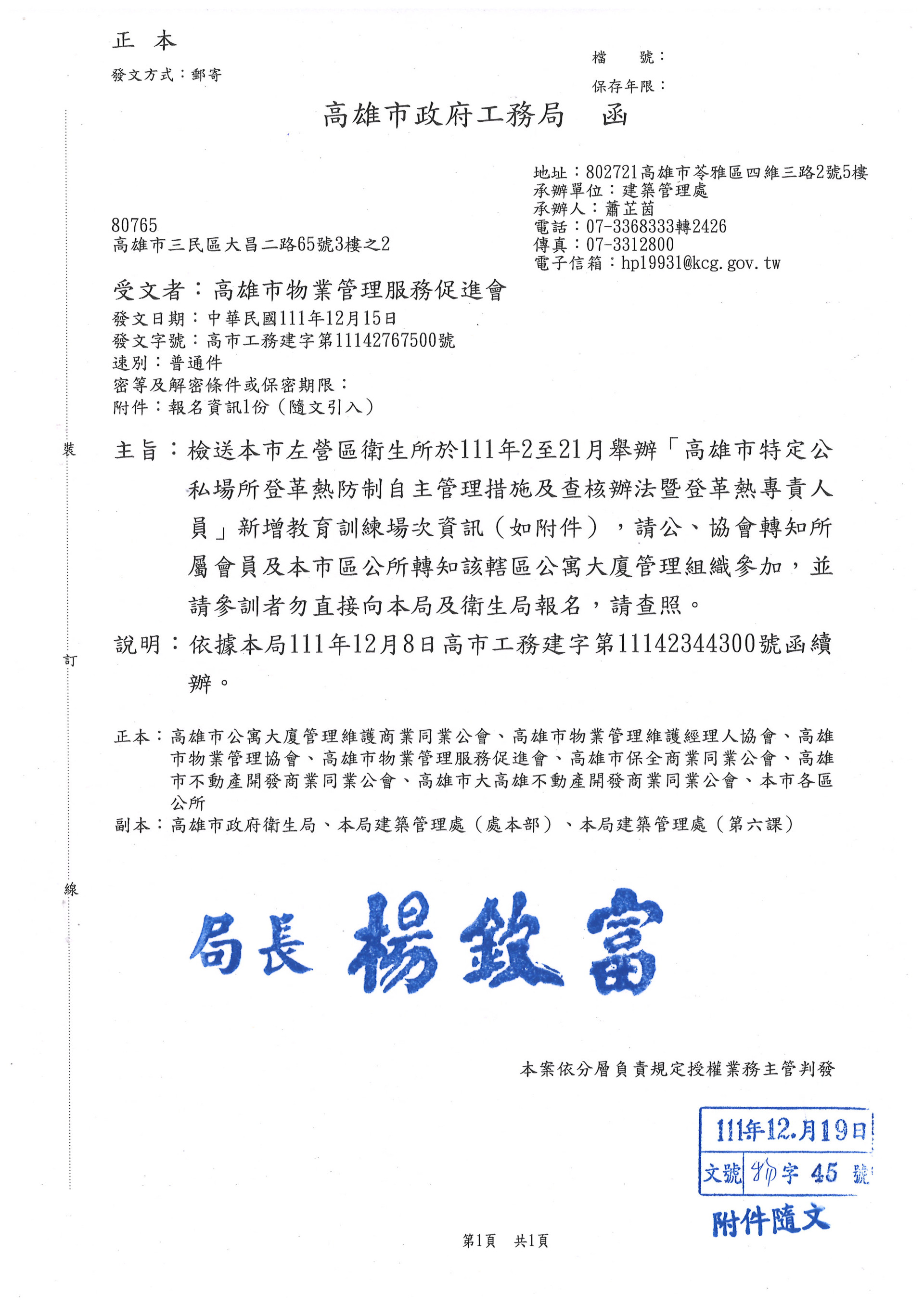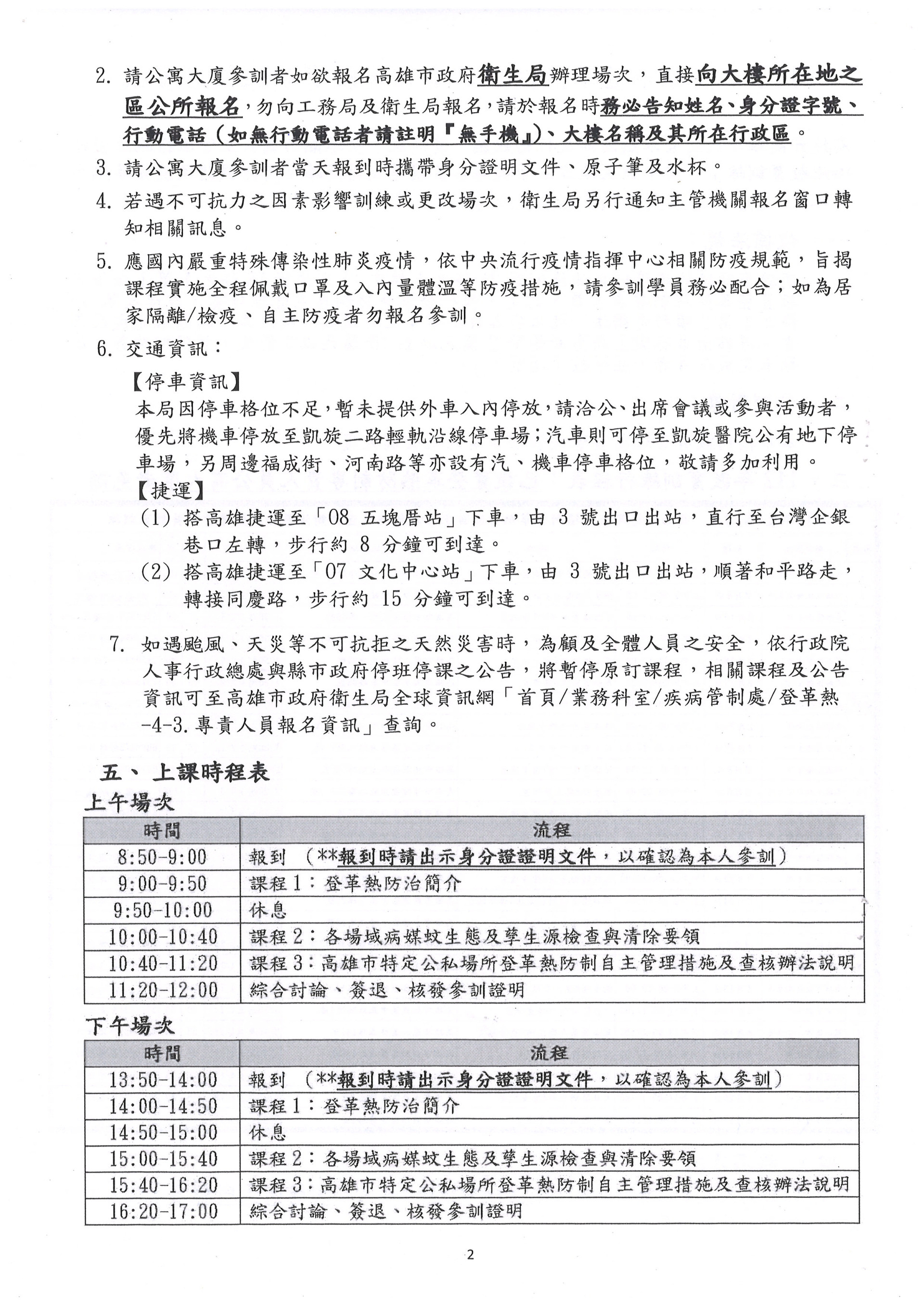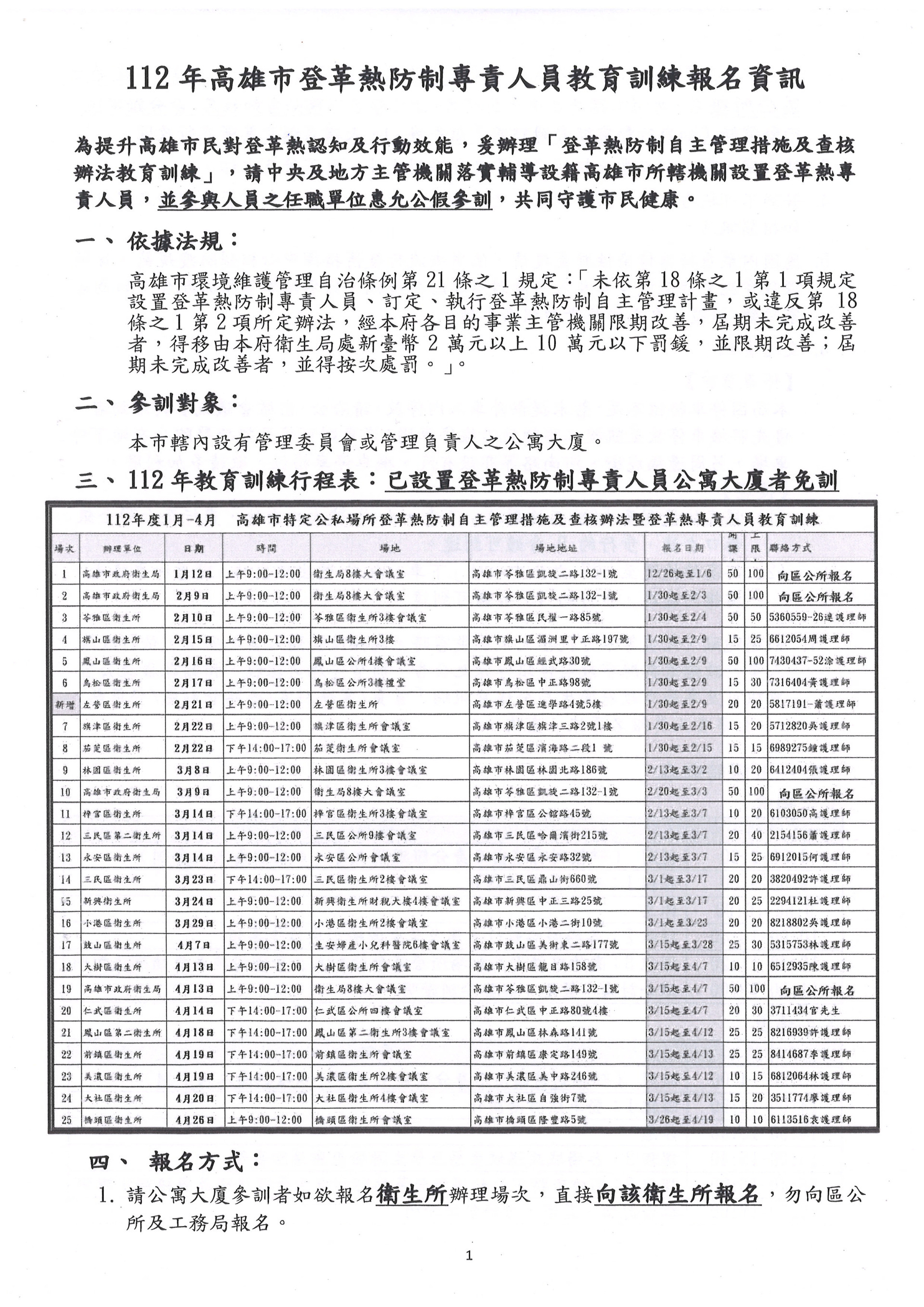 本市左營區衛生所於112年2至12月舉辦[高雄市特定公私場所登革熱防制自主管理措施及查核辦法暨登革熱專責人員]新增教育訓練資訊