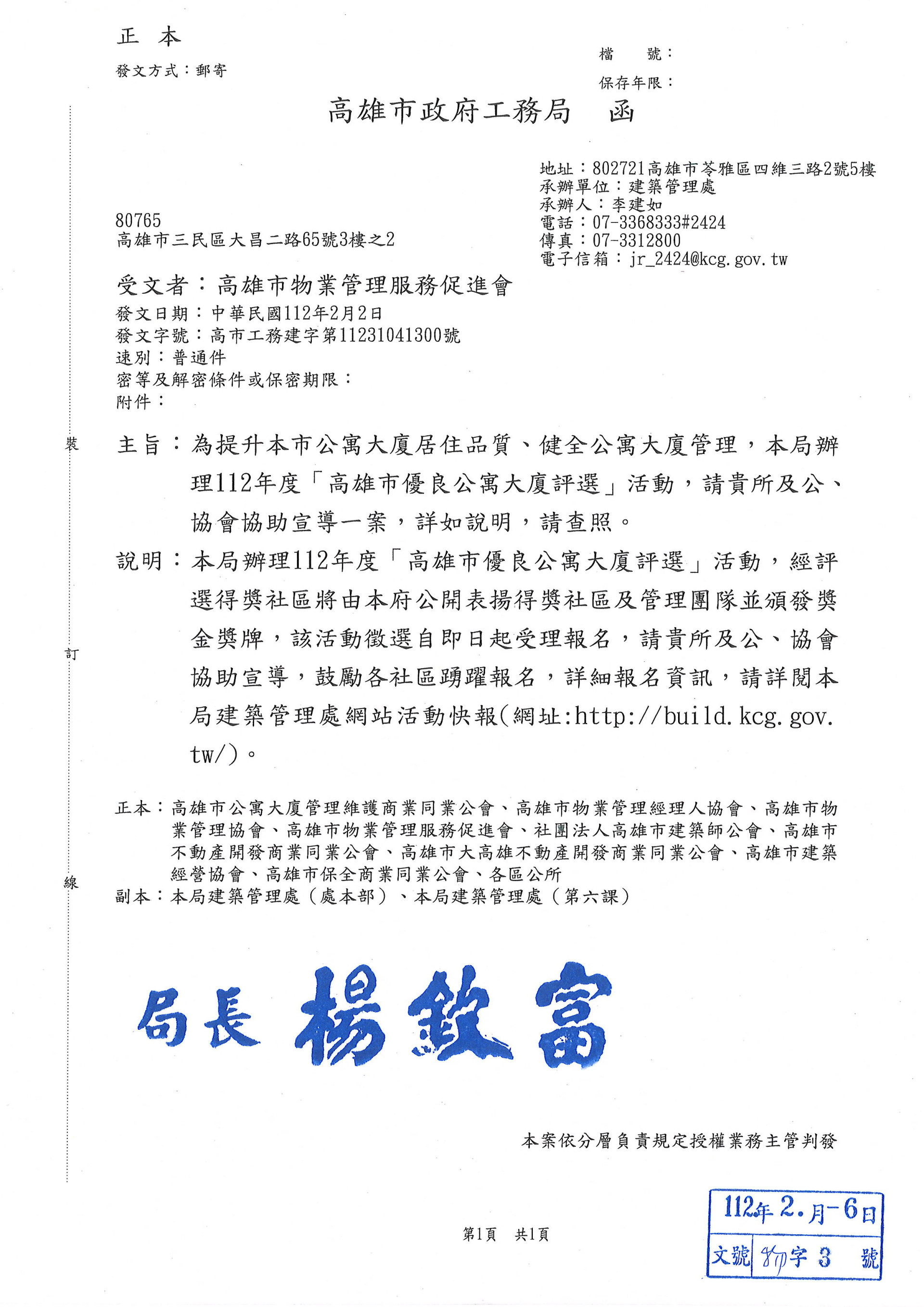 為提升本市公寓大廈居住品質、健全公寓大廈管理,本局辦理112年度[高雄市優良公寓大廈評選]活動