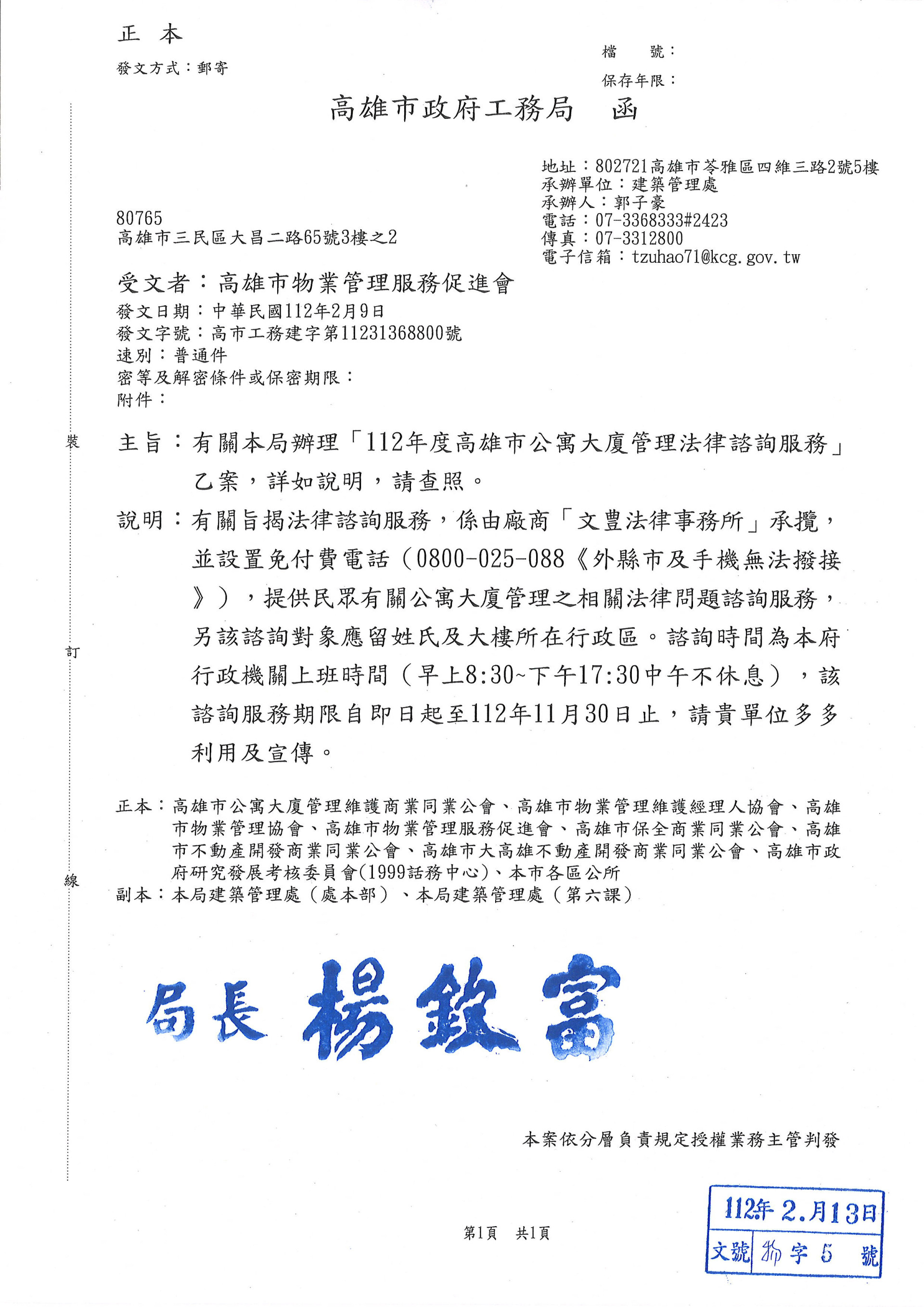 有關本局辦理[112年度高雄市公寓大廈管理法律諮詢服務]乙案