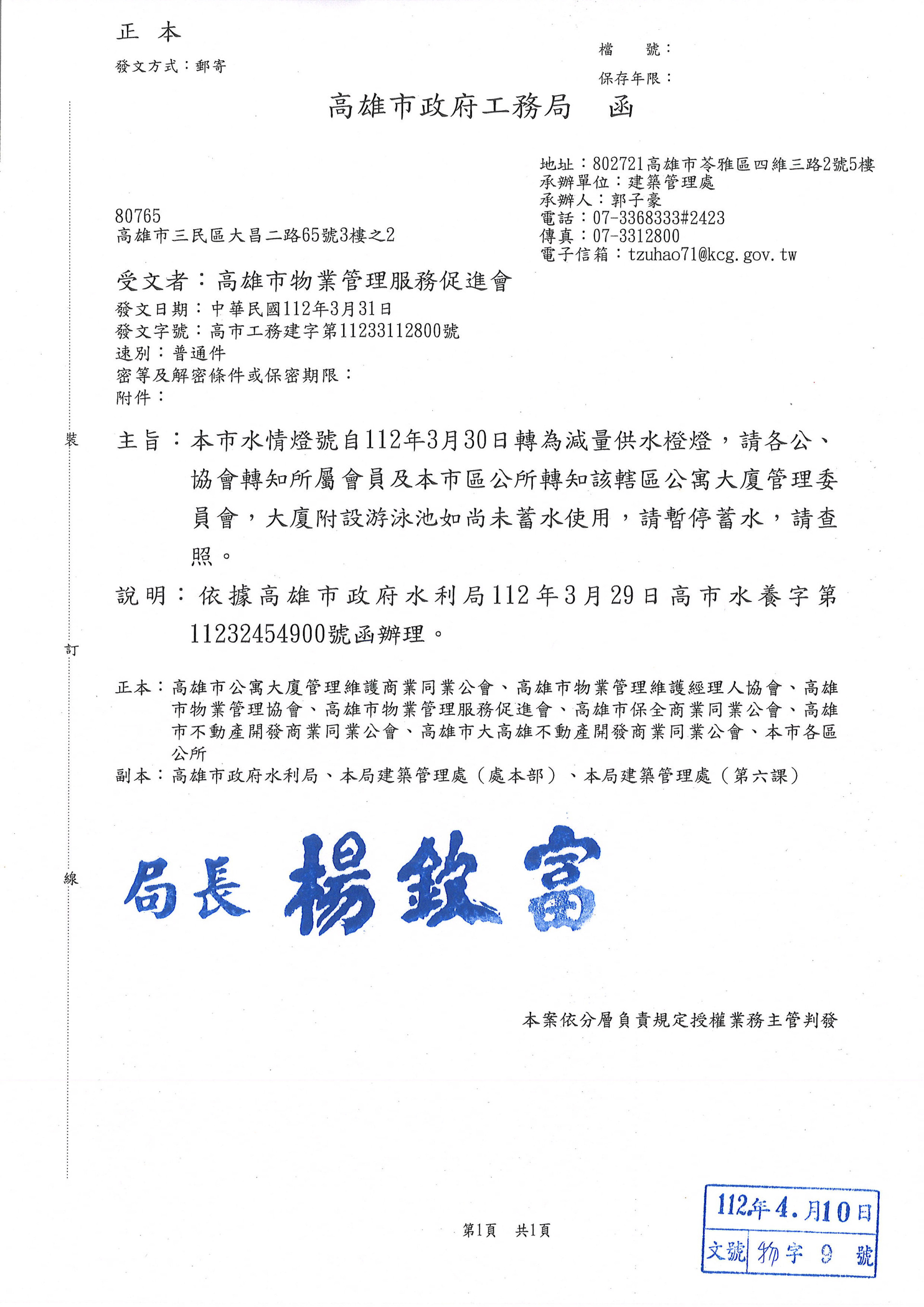 本市水情燈號自112年3月30日轉為減量供水橙燈,請轉知所屬會員,大廈附設游泳池如尚未蓄水使用,請暫停蓄水.