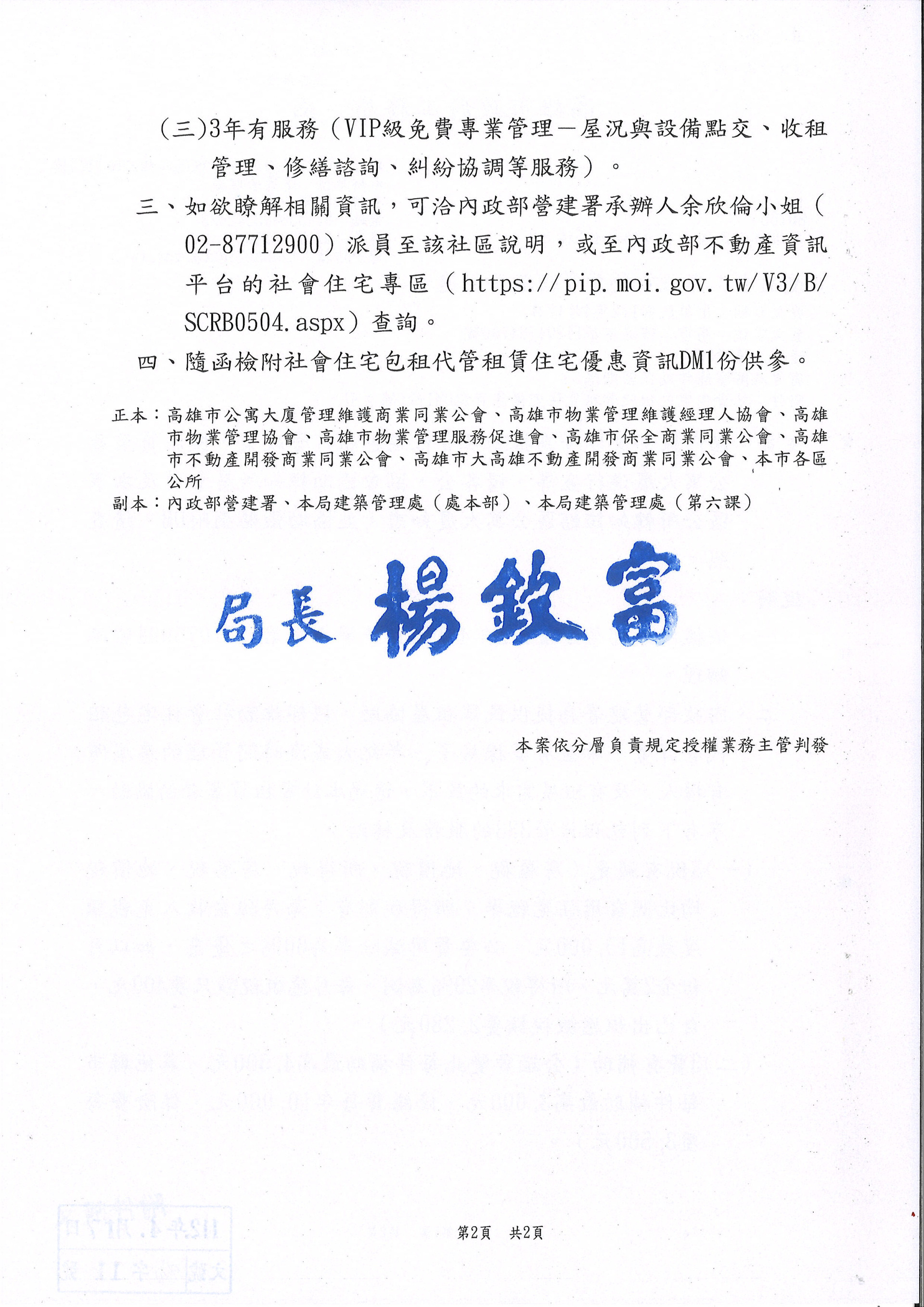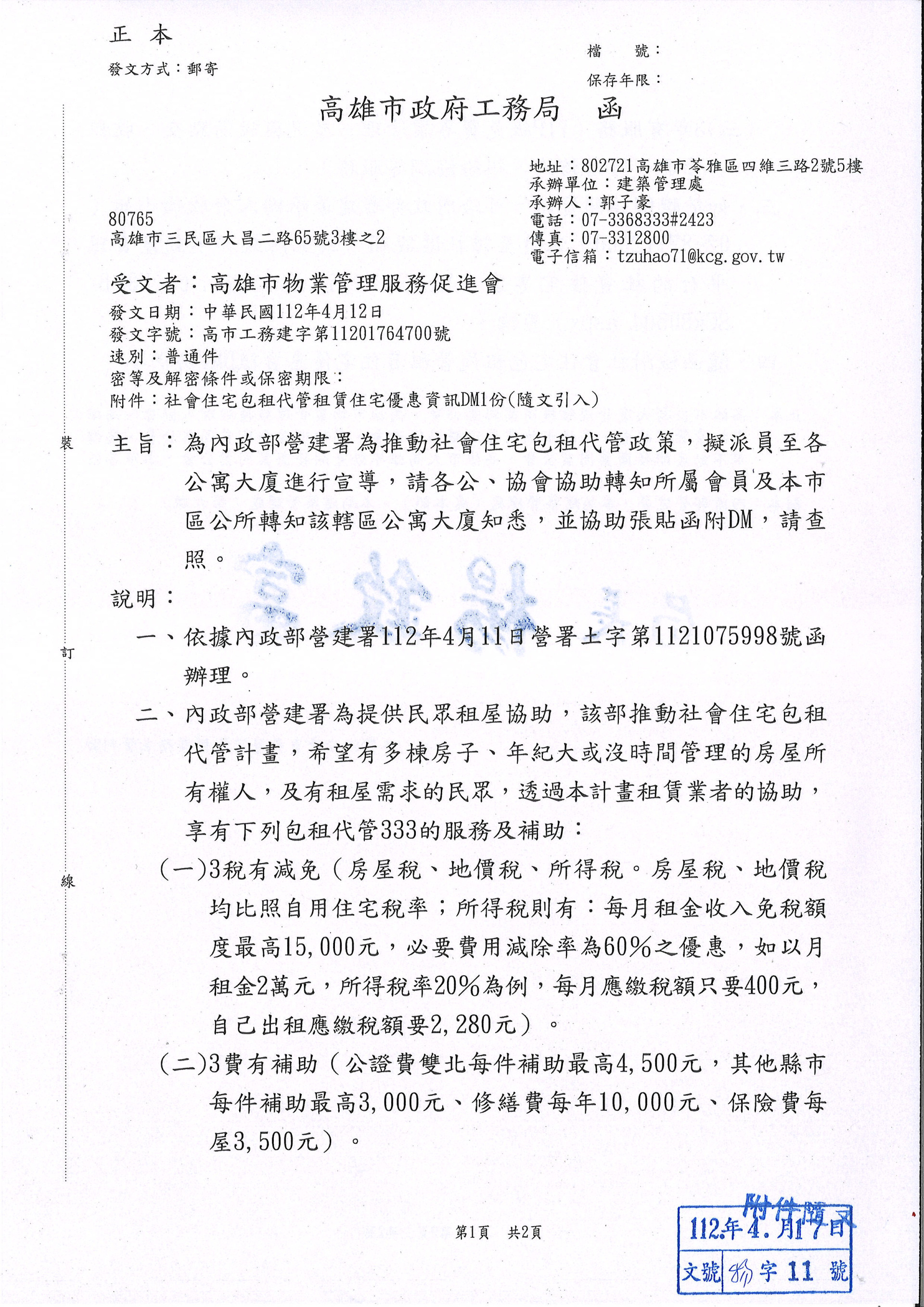 為內政部營建署推動社會住宅包租代管政策,擬派員至各公寓大廈進行宣導,請協助轉知所屬會員,並協助張貼函附DM