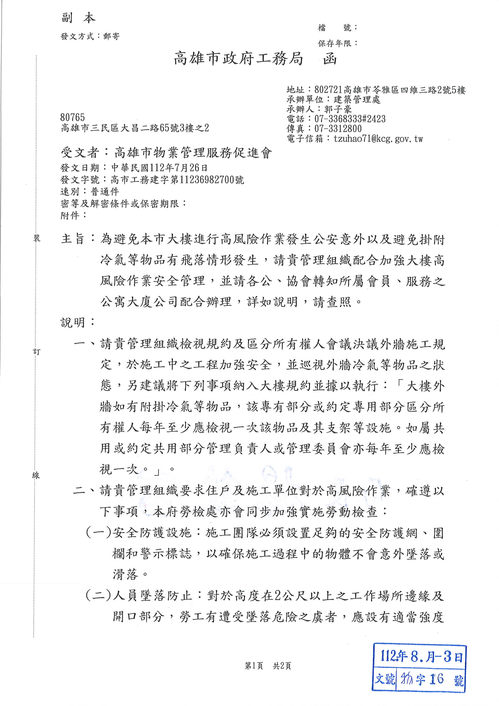 為避免本市大樓進行高風險作發生公安意外以及避免掛附冷氣等物品有飛落情形發,請貴管理組織配合加強大樓高風險作業安全管理