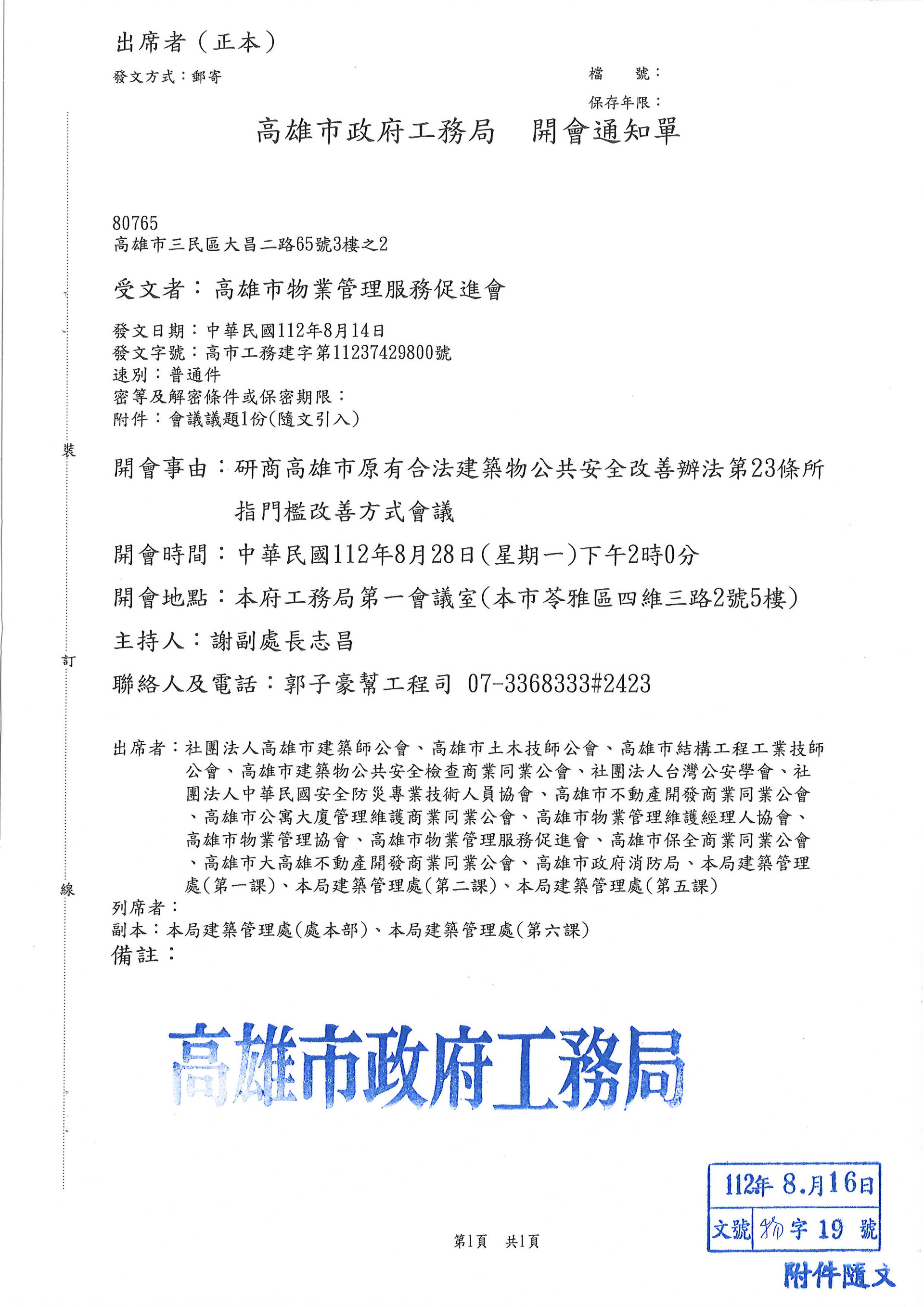 事由:研商高雄市原有合法建築物公共安全改善辦法第23條所指門檻改善方式會議,時間:112/08/28(一)1400,地點:工務局第一會議室(苓雅區四維三路2號5樓)