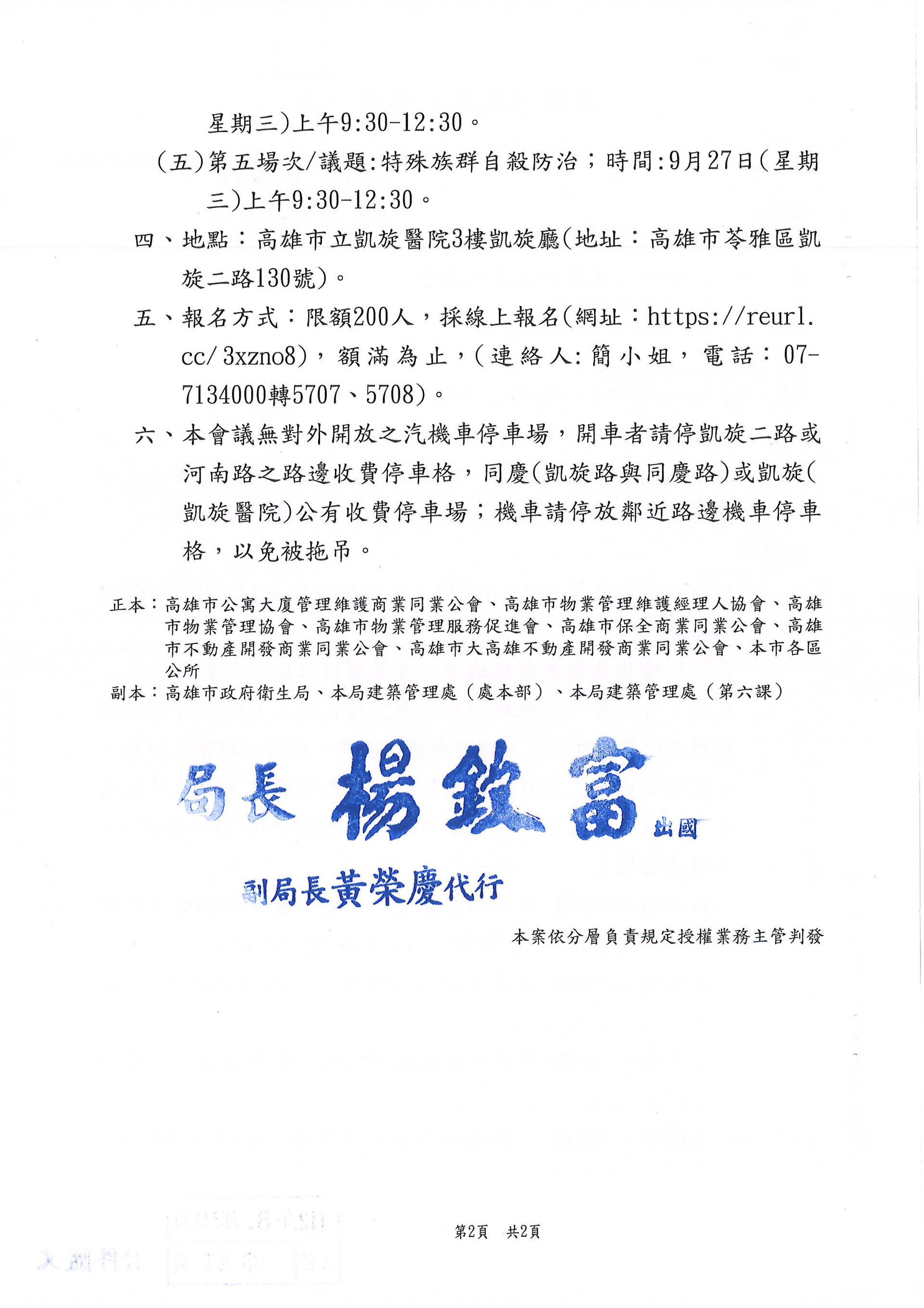 衛生局訂於112年8月至9月辦理[高雄市珍愛生命雄幸福論壇]五場論壇