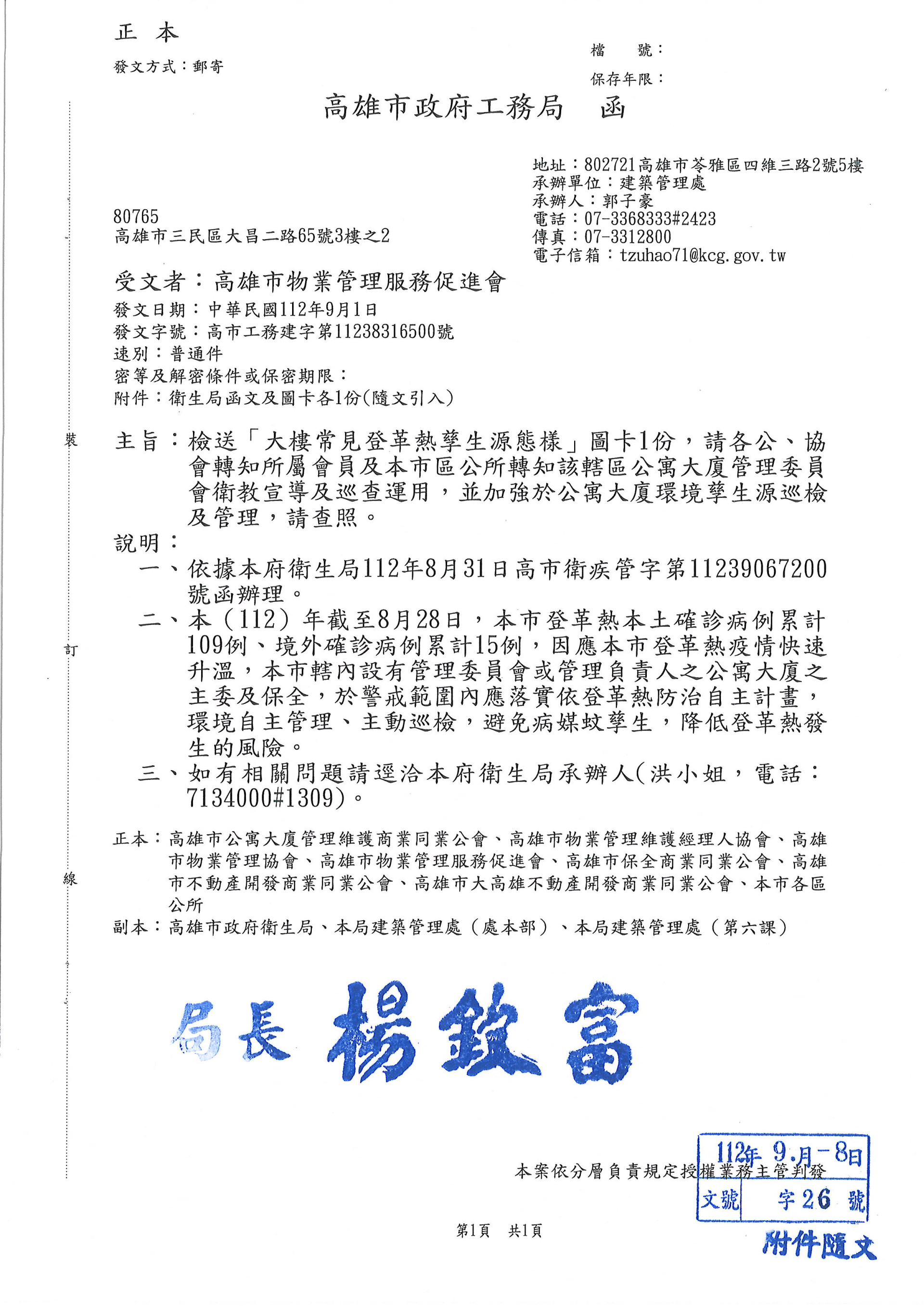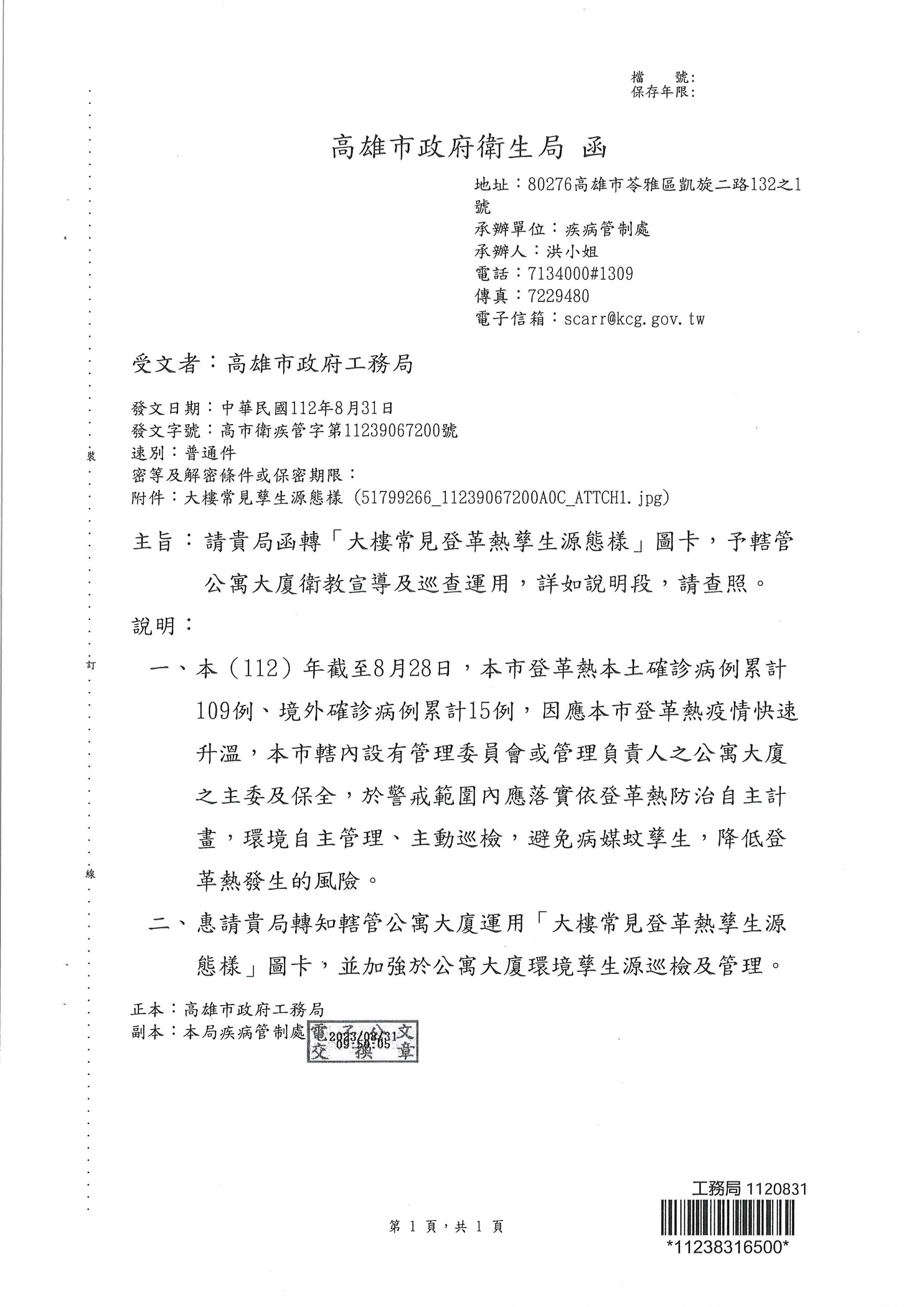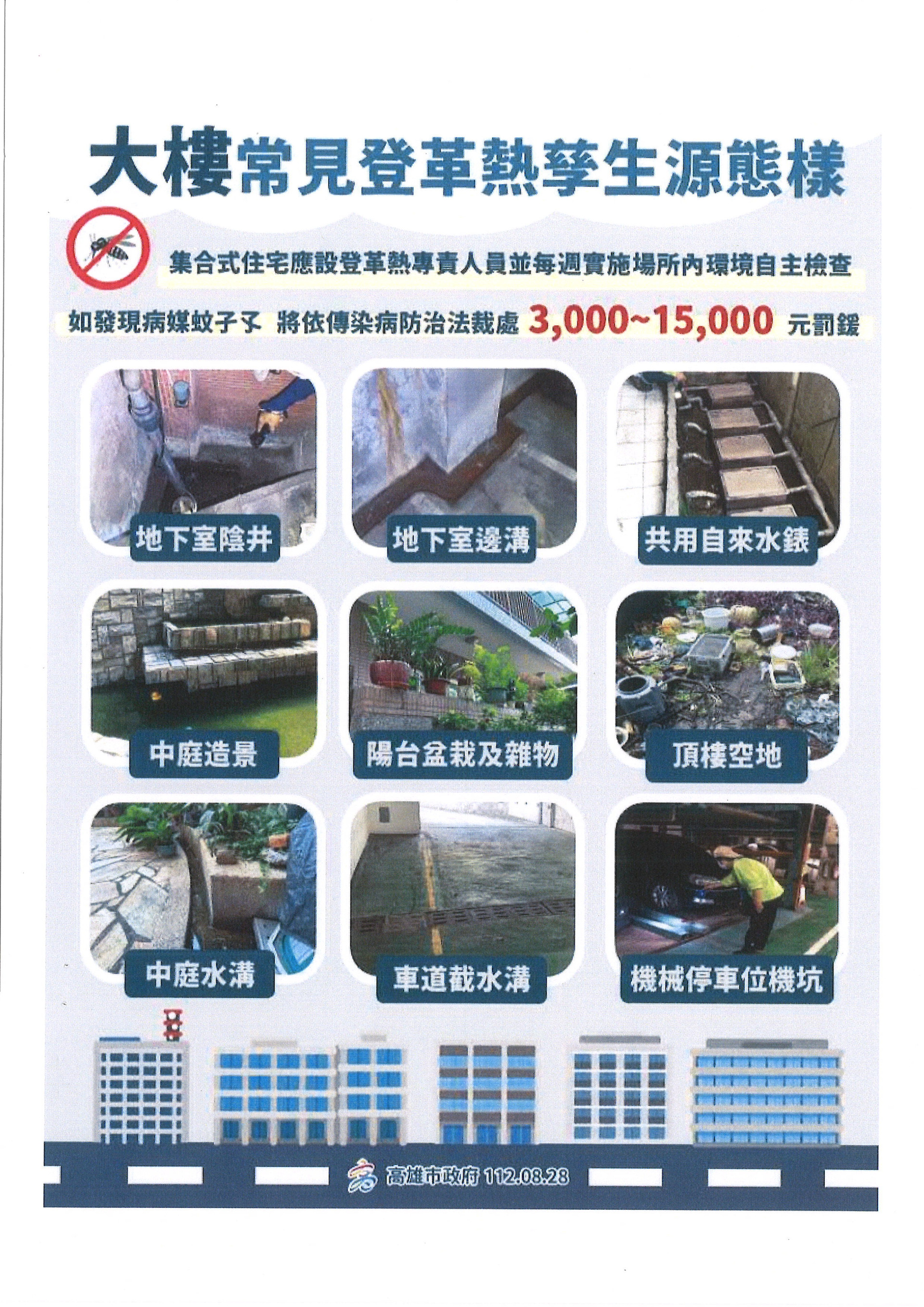 檢送[大樓常見登革熱孳生源態樣]圖卡,轉知轄區公寓大廈管委會衛教宣導及巡查運用,並加強公寓大廈環境孳生源巡檢及管理