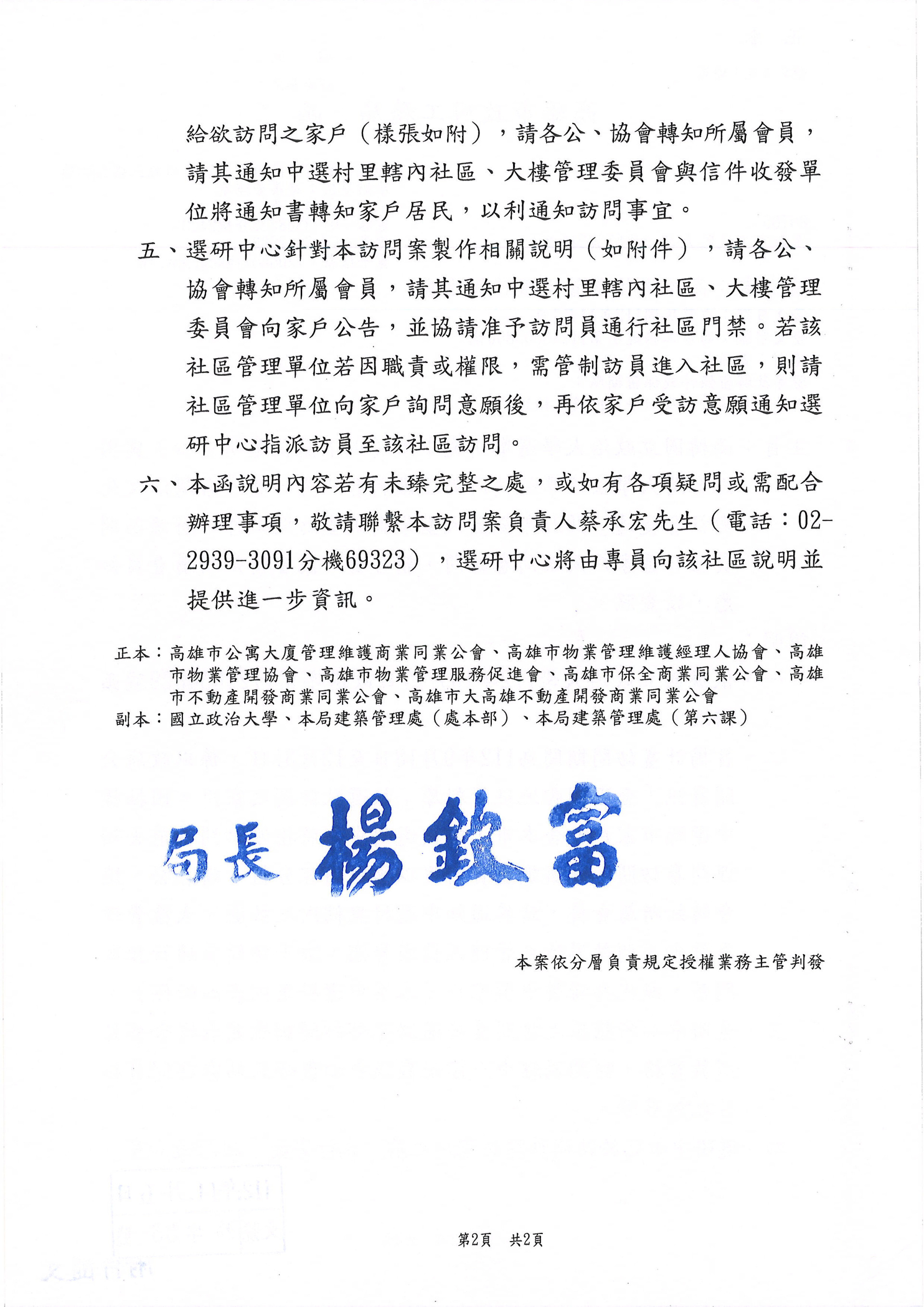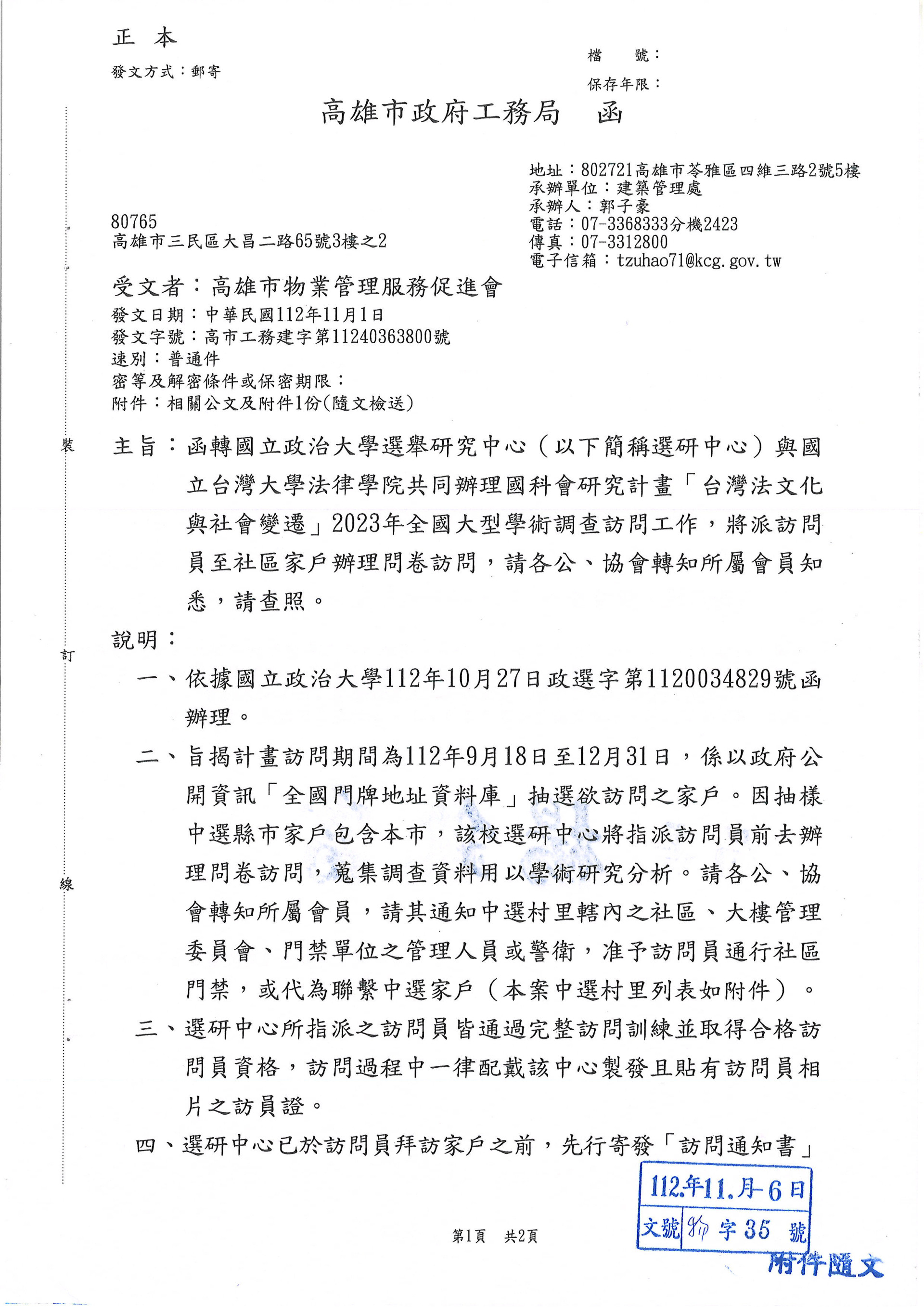 函轉政治大學選舉研究中心與台大法律學院共同辦理國科會研究計畫[台灣法文化與社會變遷]2023全國大型學術調查訪問工作