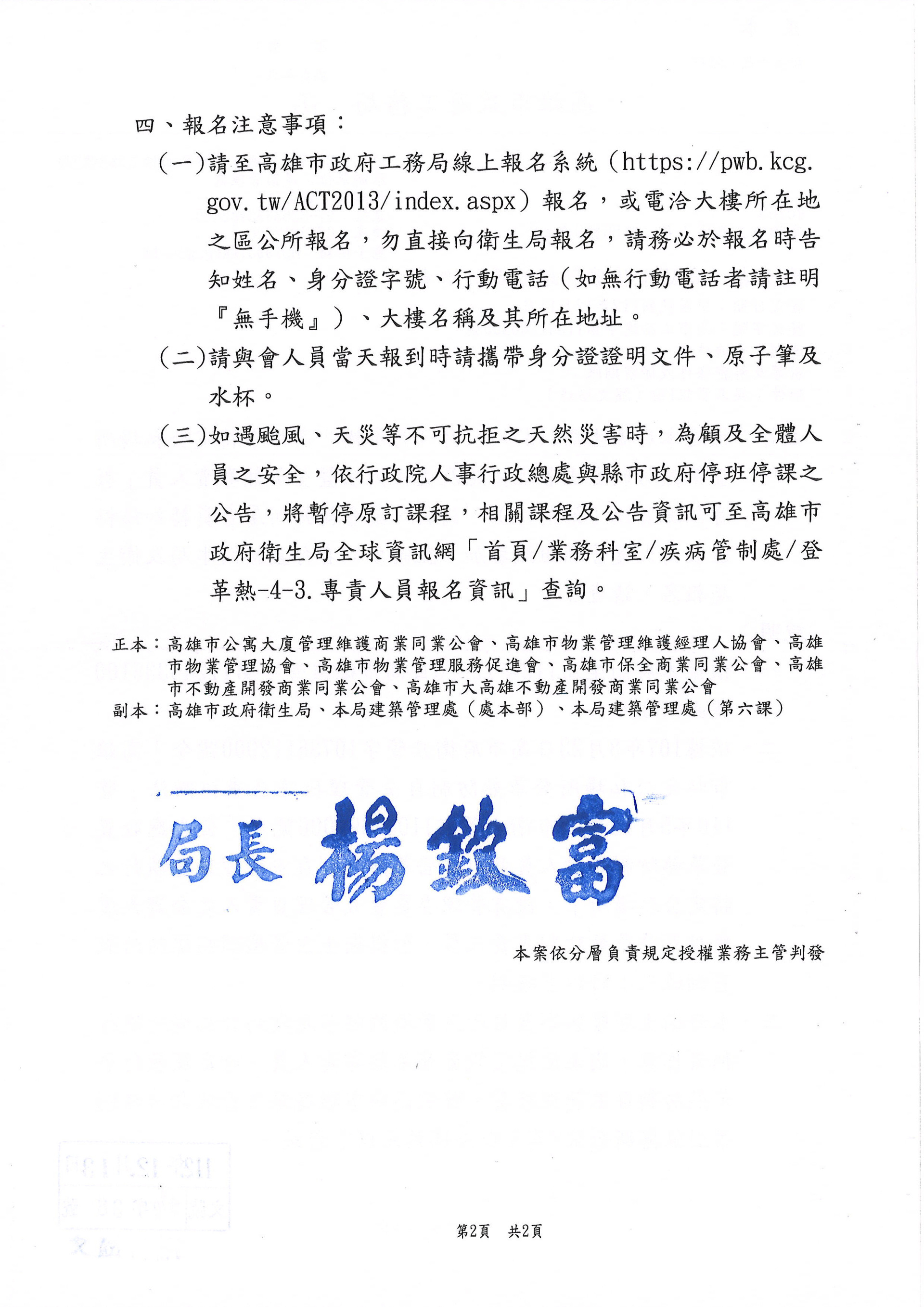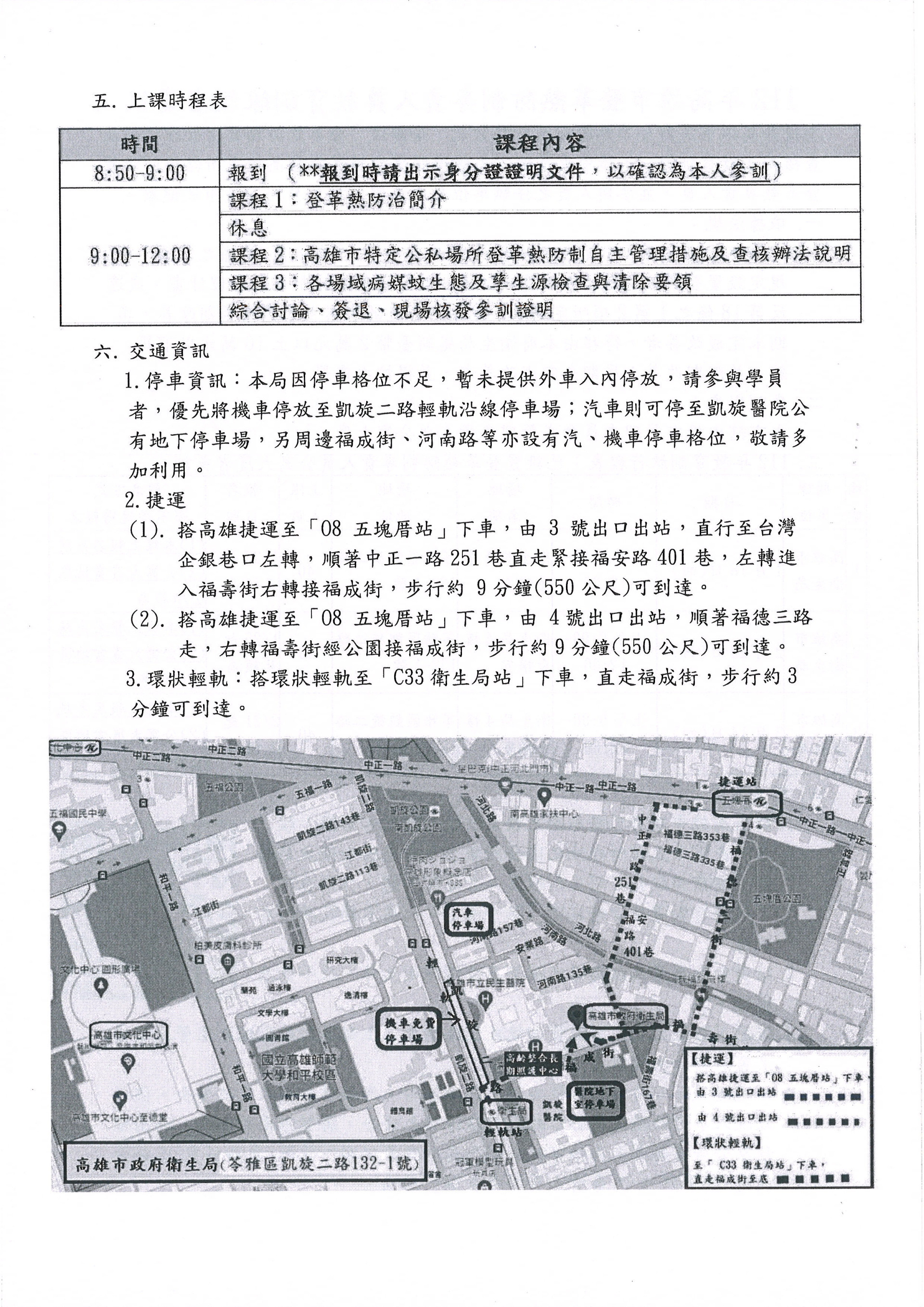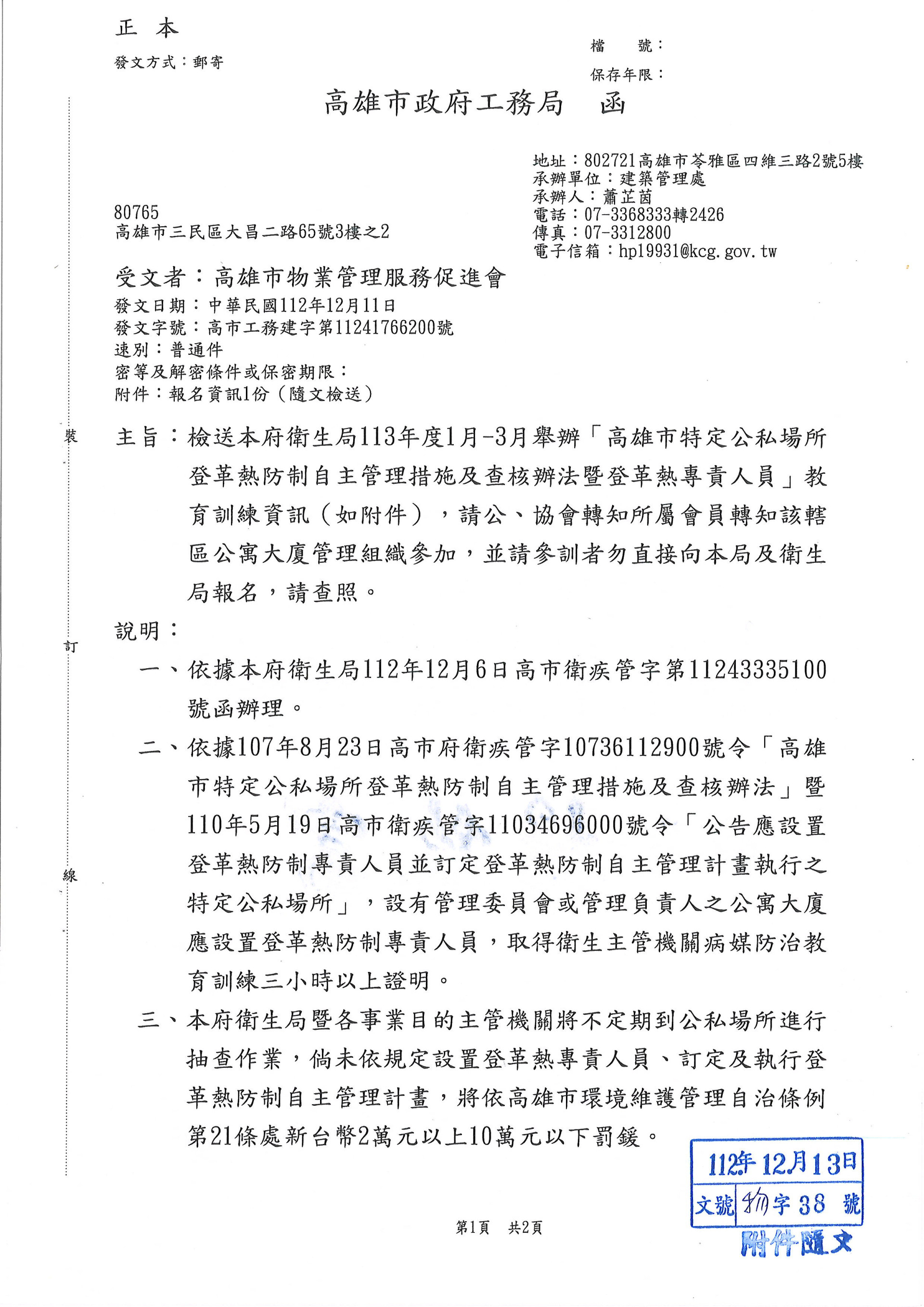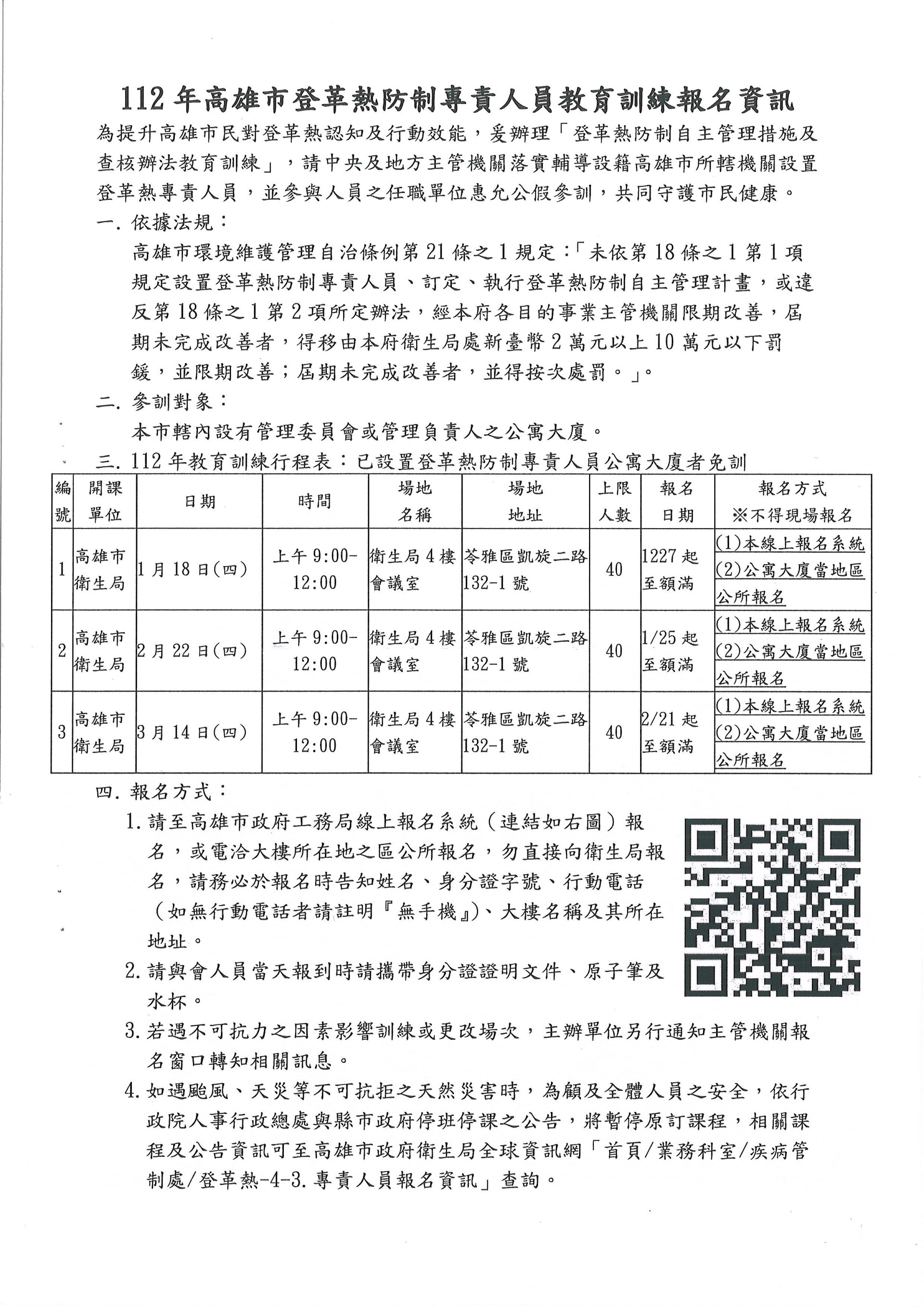 檢送本府衛生局113年度1月-3月舉辦[高雄市特定公私場所登革熱防制自主管理措施及查核辦法暨登革熱專責人員]教育訓練資訊