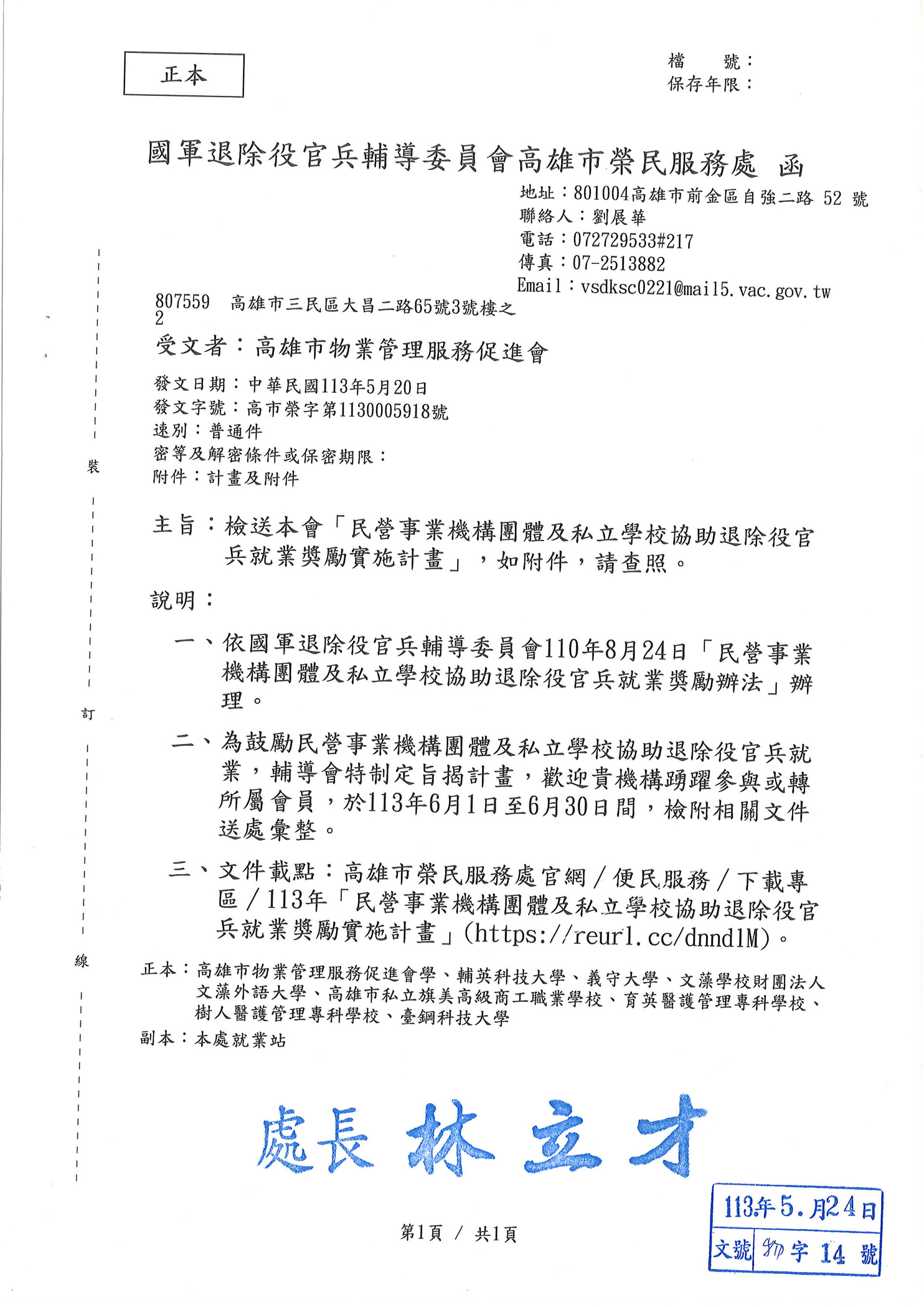 檢送本會[民營事業機構團體及私立學校協助退除役官兵就業獎勵實施計畫]