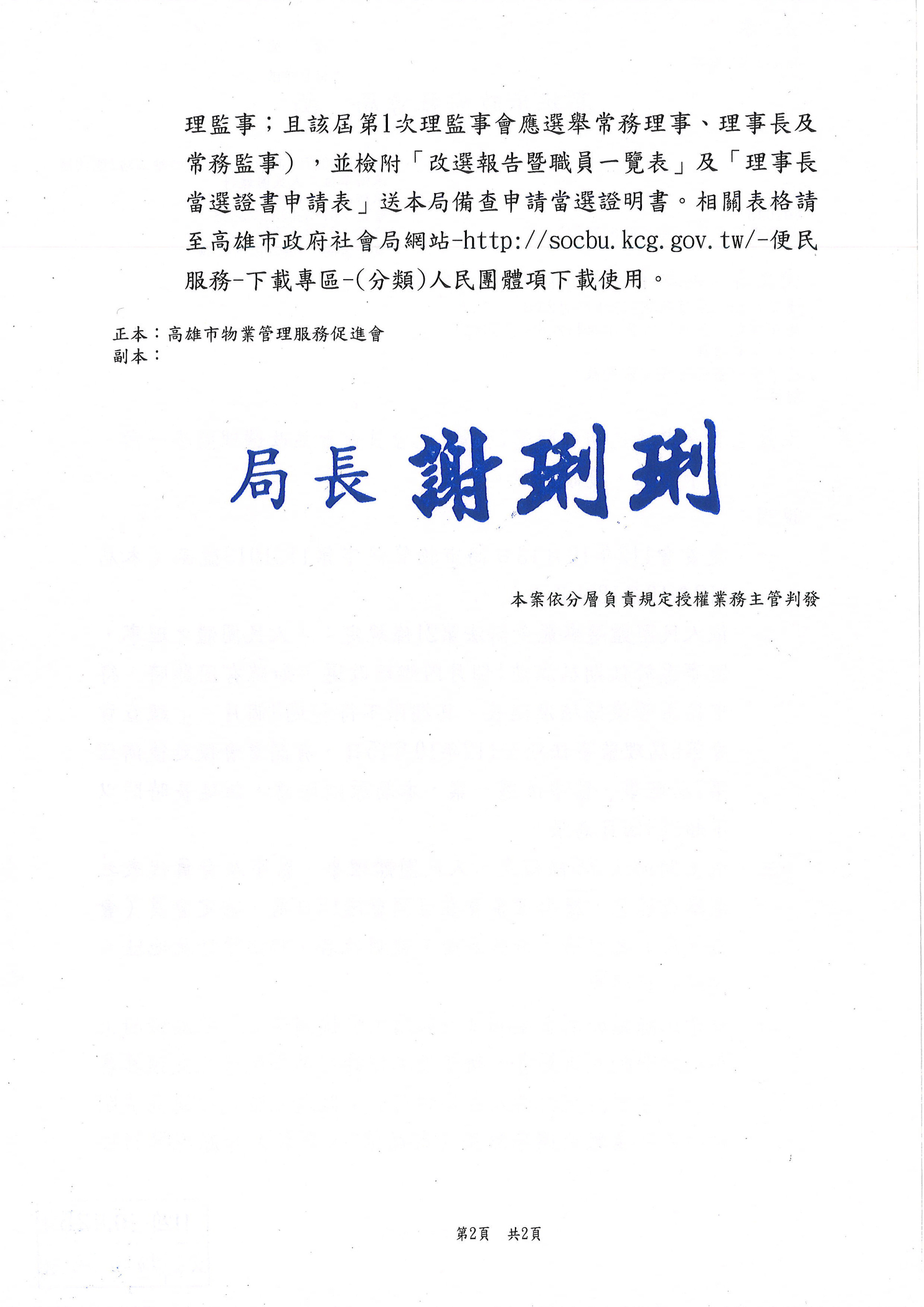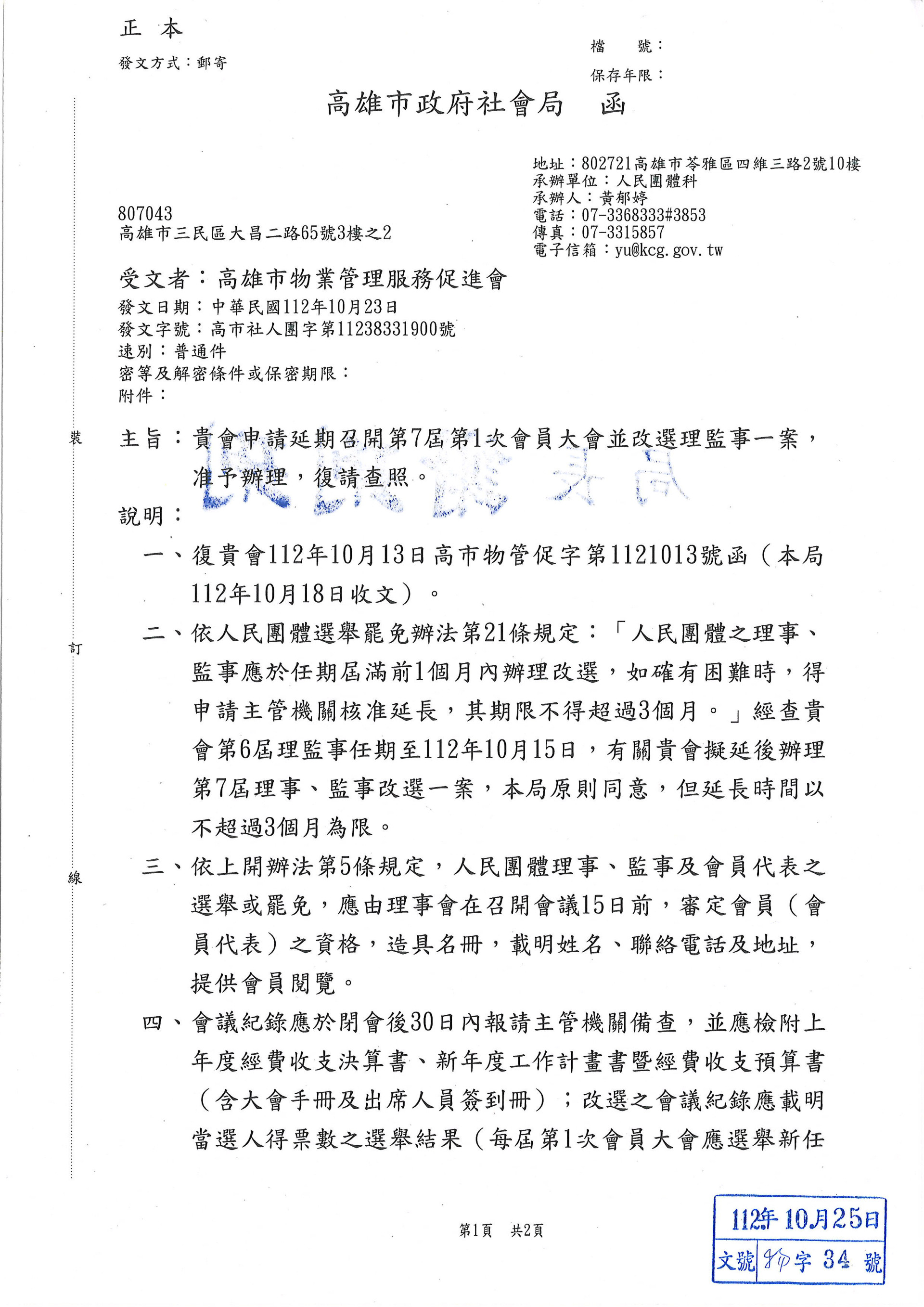 貴會申請延期召開第7屆第1次會員大會並改選理監事一案,淮予辦理.